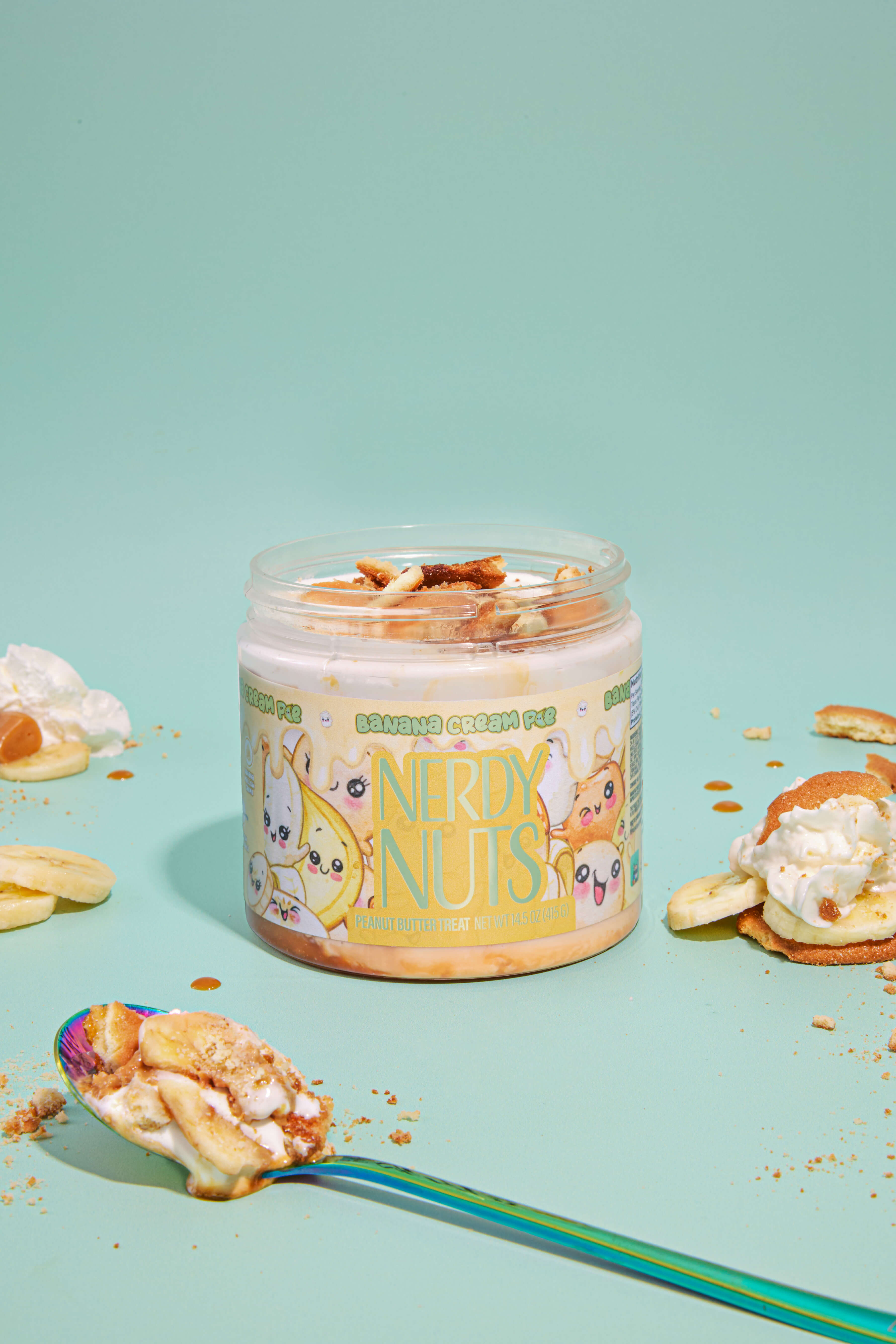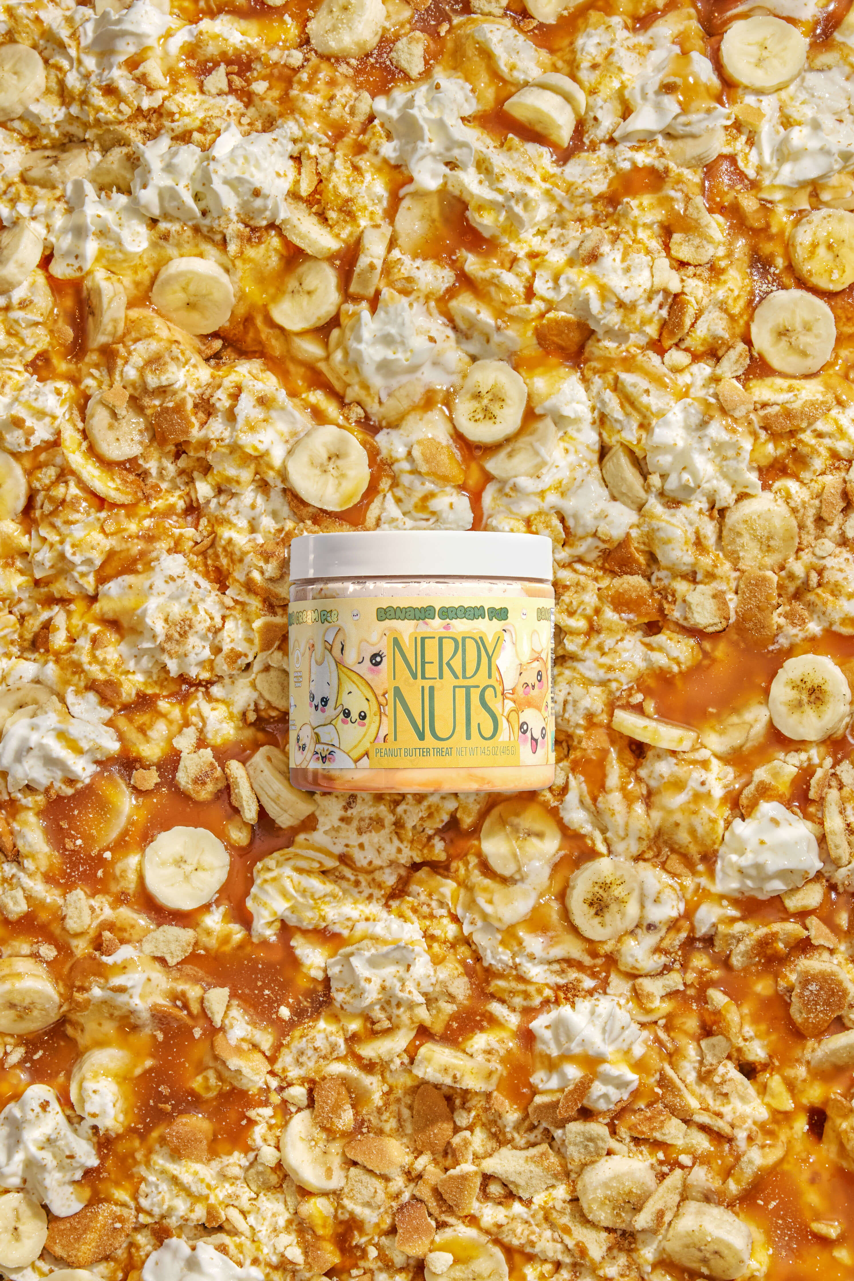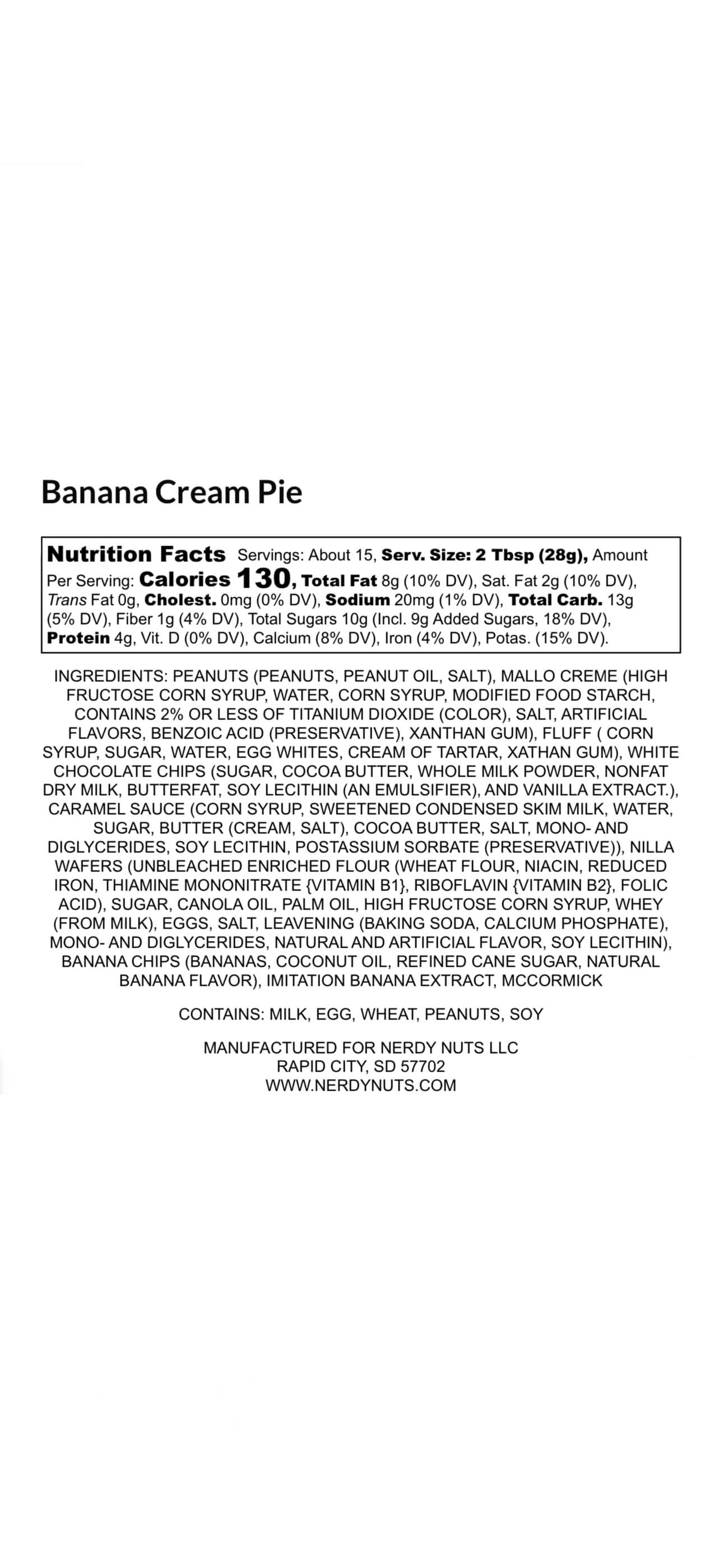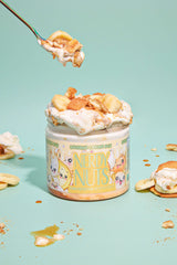 Banana Cream Pie starts with our white chocolate peanut butter layered on top of fluff and caramel sauce. We then top this off with banana infused cream, Nilla Wafers, and dried banana chips!