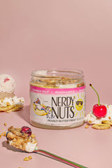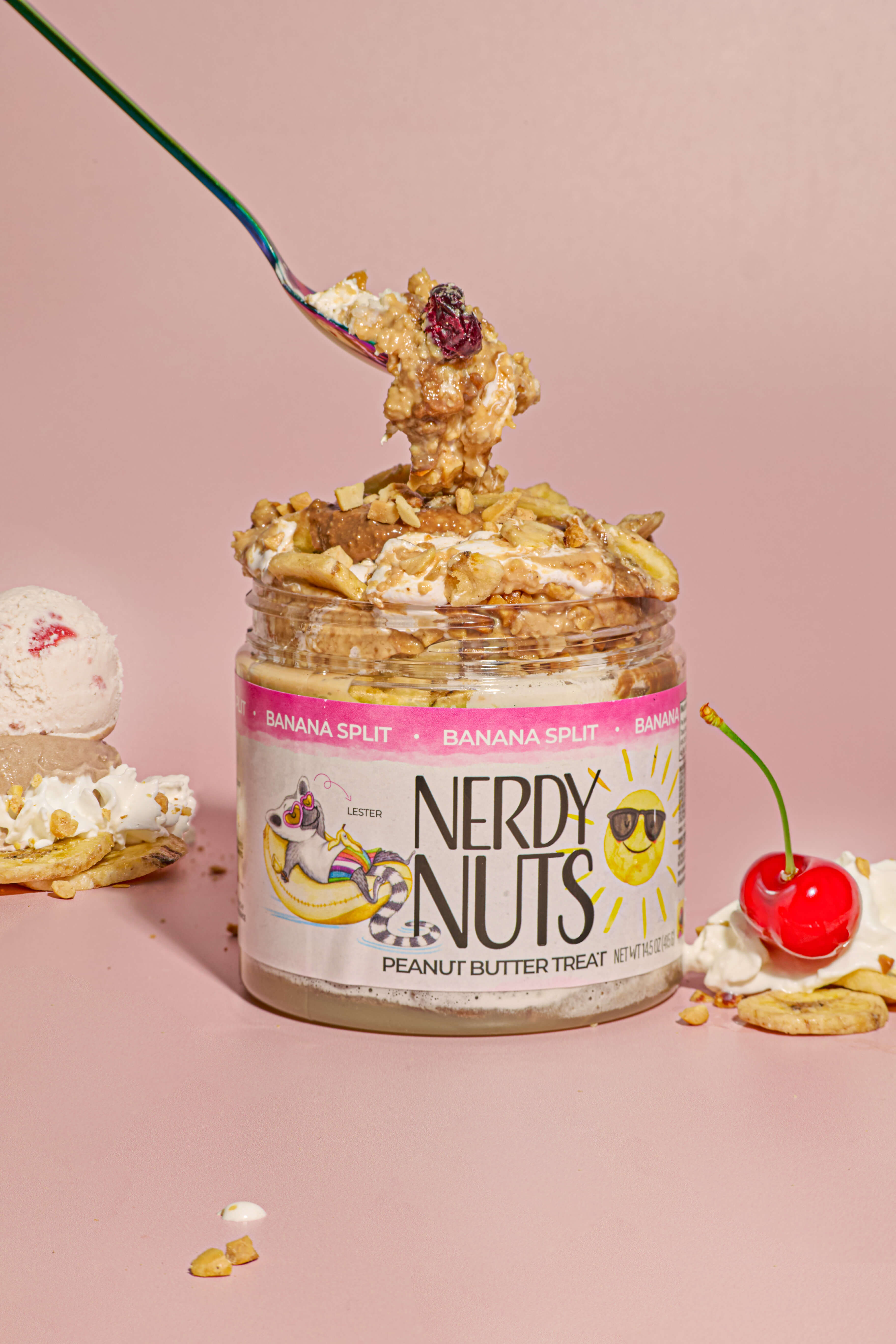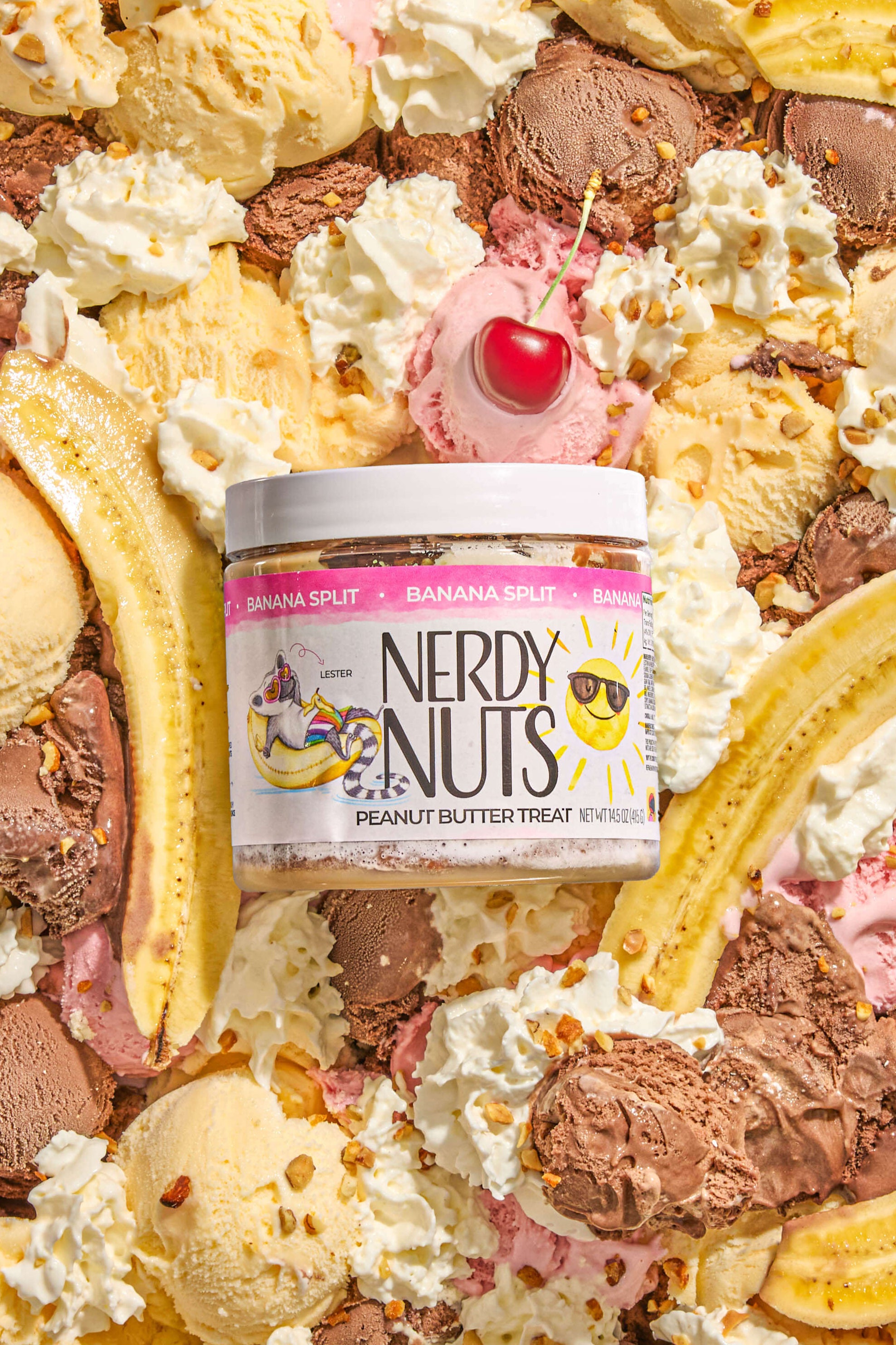 Banana Split has all the layers: milk chocolate peanut butter, strawberry white chocolate peanut butter, marshmallow fluff, and banana sauce. We top this split with a dollop of frosting, chopped peanuts, dried banana chips, and one dried cherry!