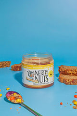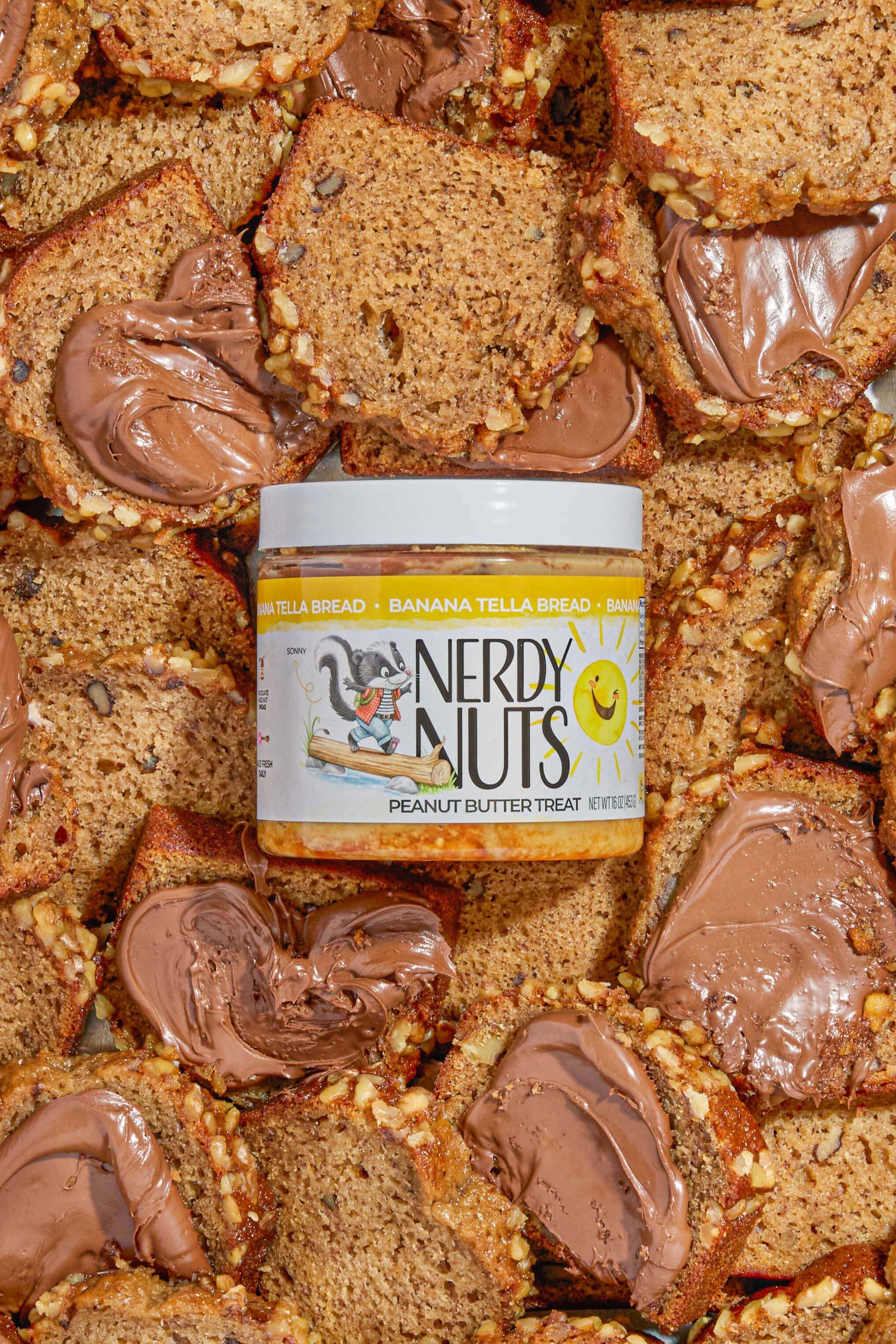 Banana bread peanut butter is layered on caramelized banana bread sauce, topped with chocolate hazelnut spread & PB candy!