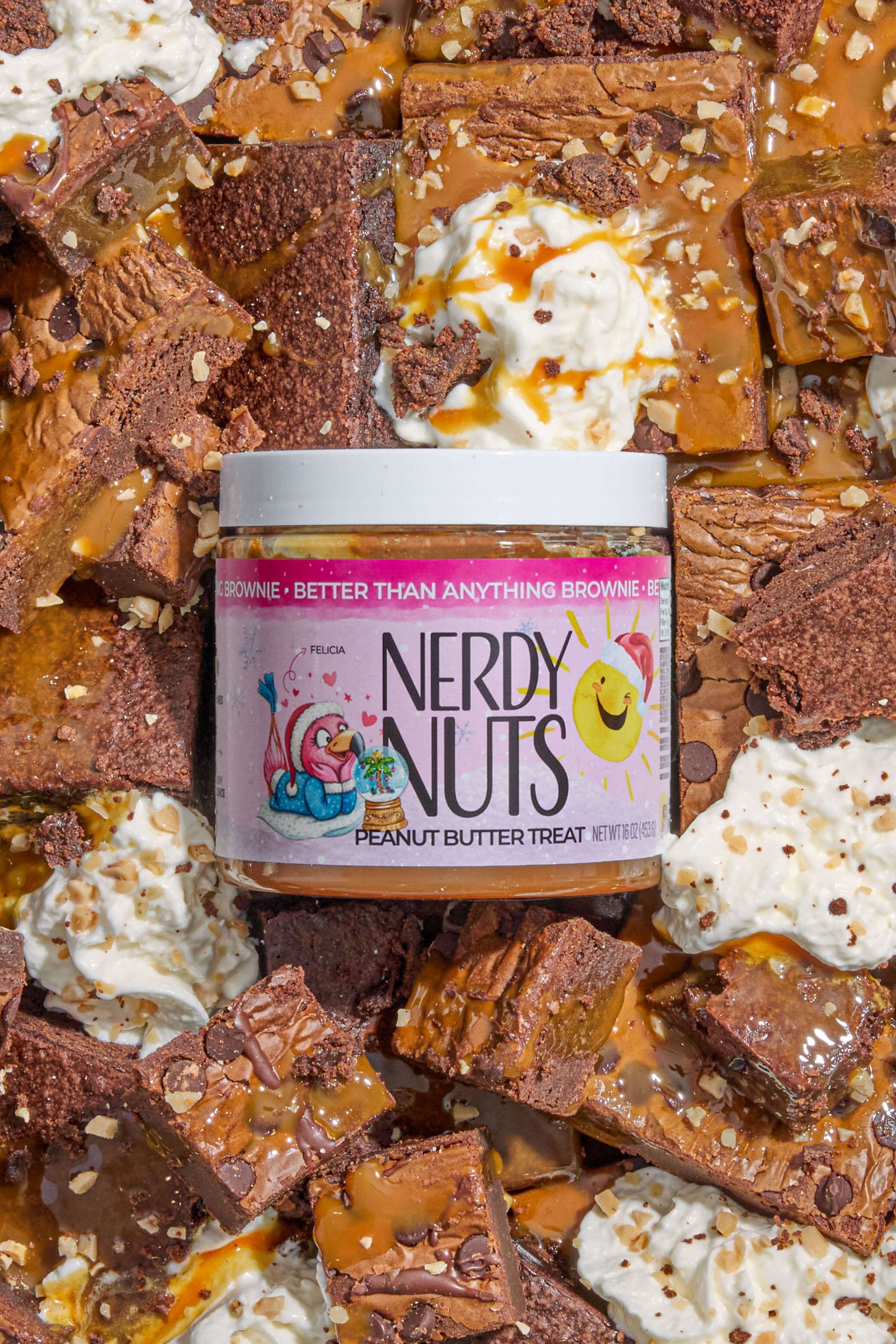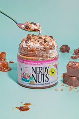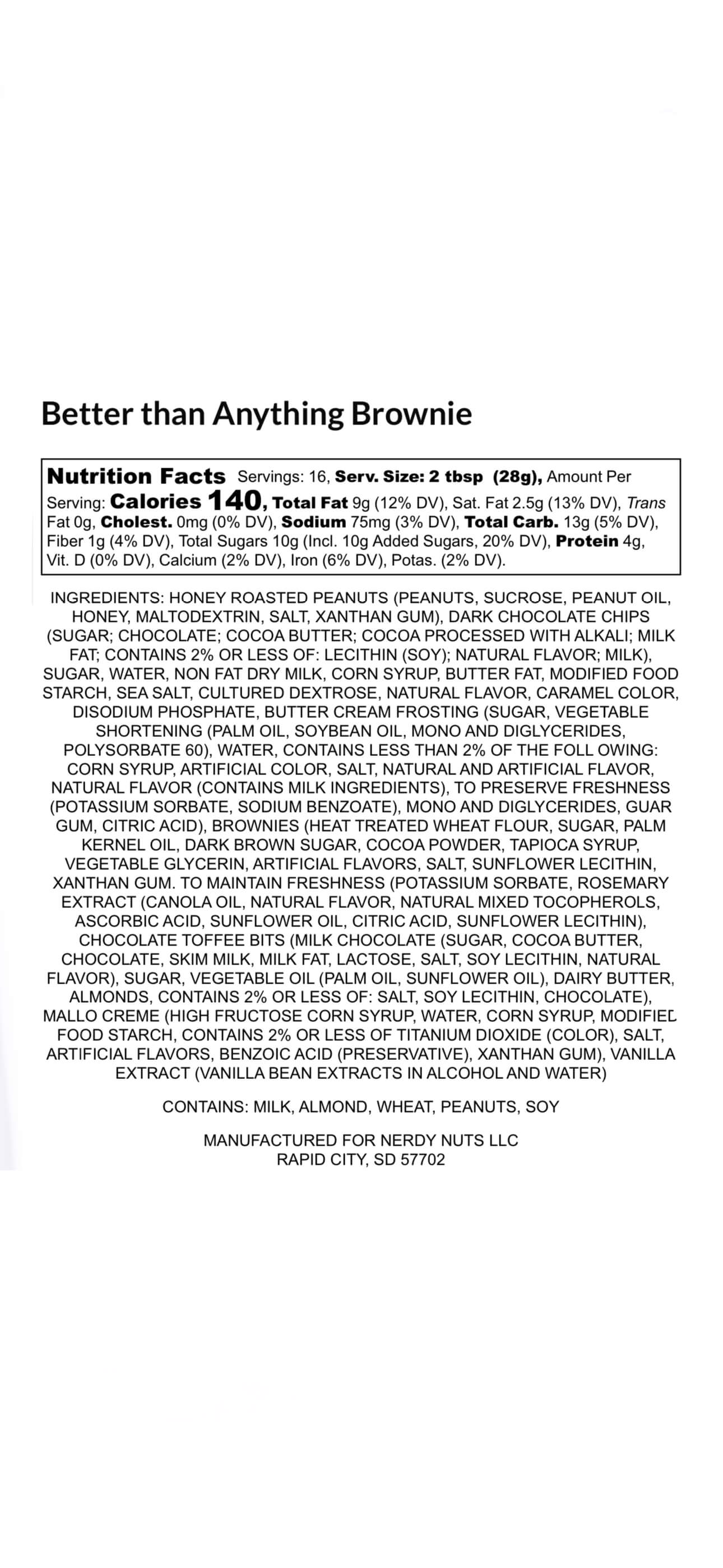 Sweet dark chocolate peanut butter is layered on sea salt caramel toffee sauce, swirled with whipped cream flavored mallow frosting, topped with toffee bits and brownies!