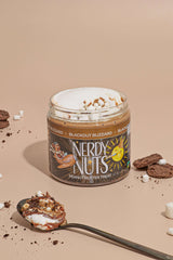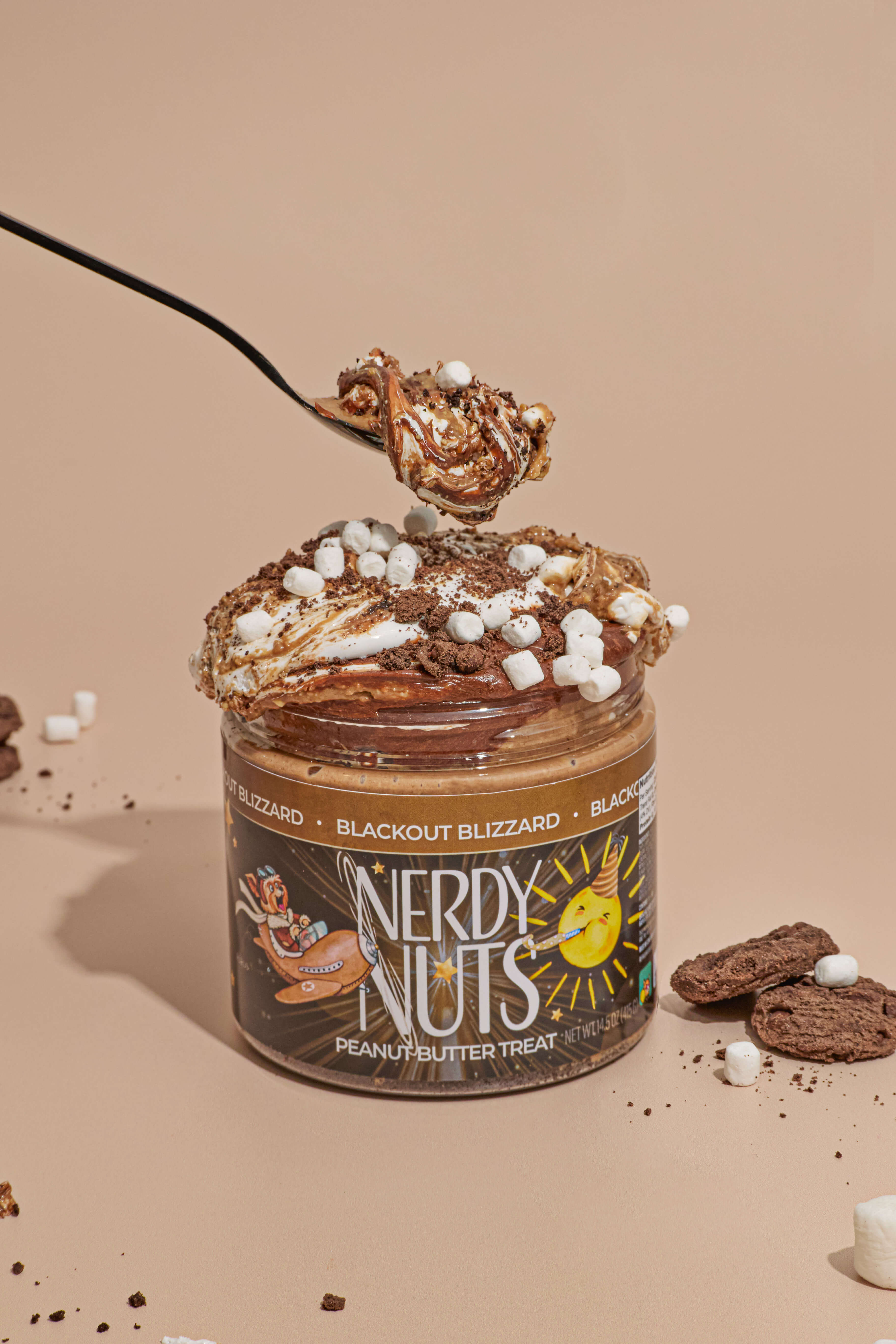 Blackout Blizzard starts with our cozy hot cocoa peanut butter. We add in a swipe of marshmallow fluff and chocolate cookie crumbs, and top it off with a plop of chocolate frosting and dehydrated mallow bits! Now THAT is a lasagna we can get behind.