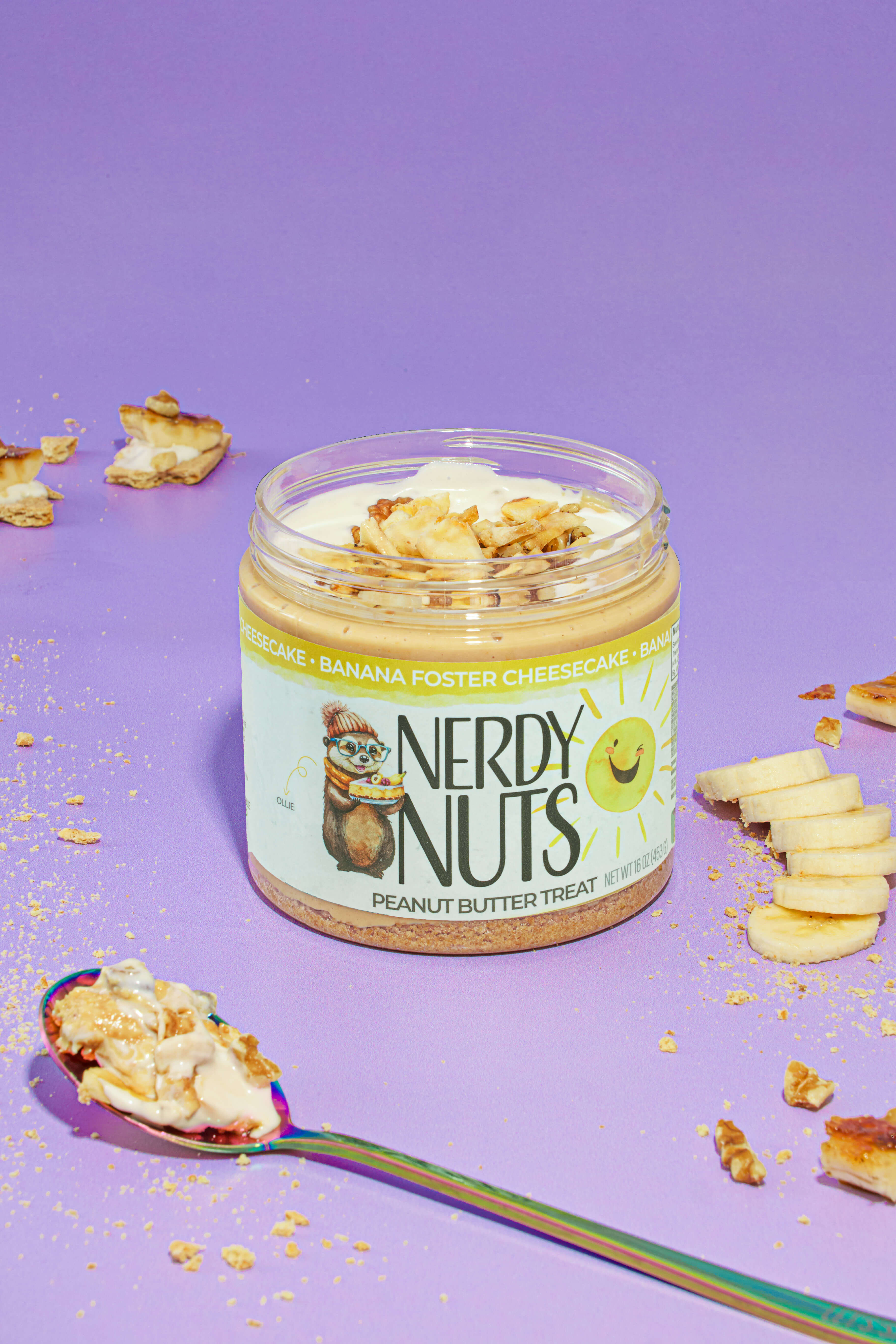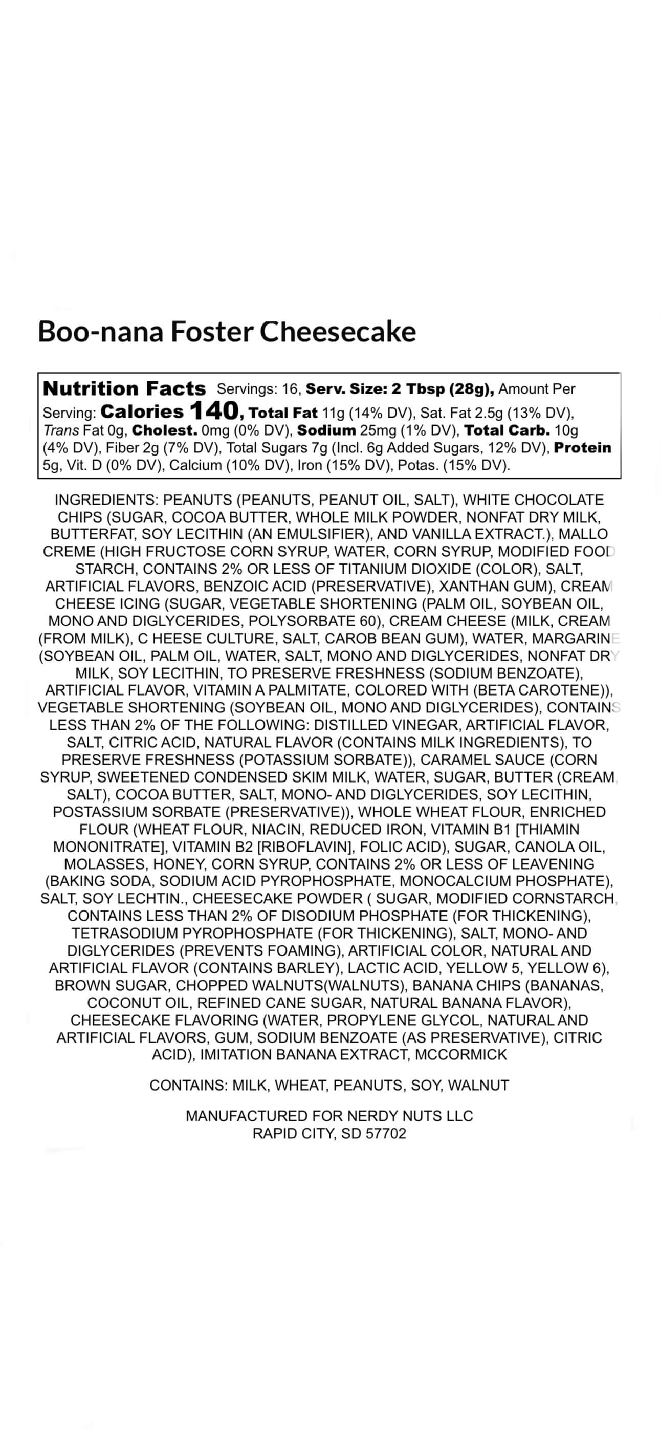 BOO-YA! Bananas Foster Cheesecake is Casper's top-requested flavor White chocolate cheesecake peanut butter is layered on graham cracker crumbs, topped with caramel mallow creme, banana cheesecake mallow frosting, dried banana chips, and walnuts. This peanut butter treat has been spooky-season certified! *Images are shot in a temperature control environment. Product will shift/sink in transit and can melt when shipped to warm climates.