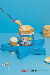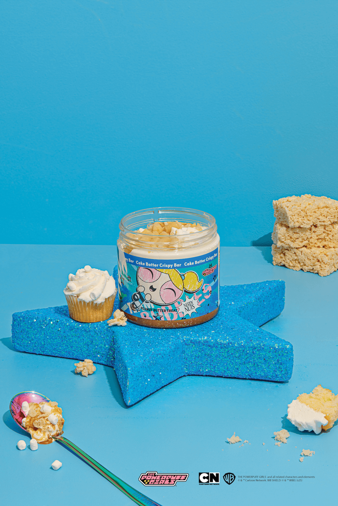 “Smunchy” yellow cake peanut butter is layered on fluff and yellow cake batter sauce, topped with crispy rice cereal, dehydrated marshmallow bits, & birthday cake dough centers!