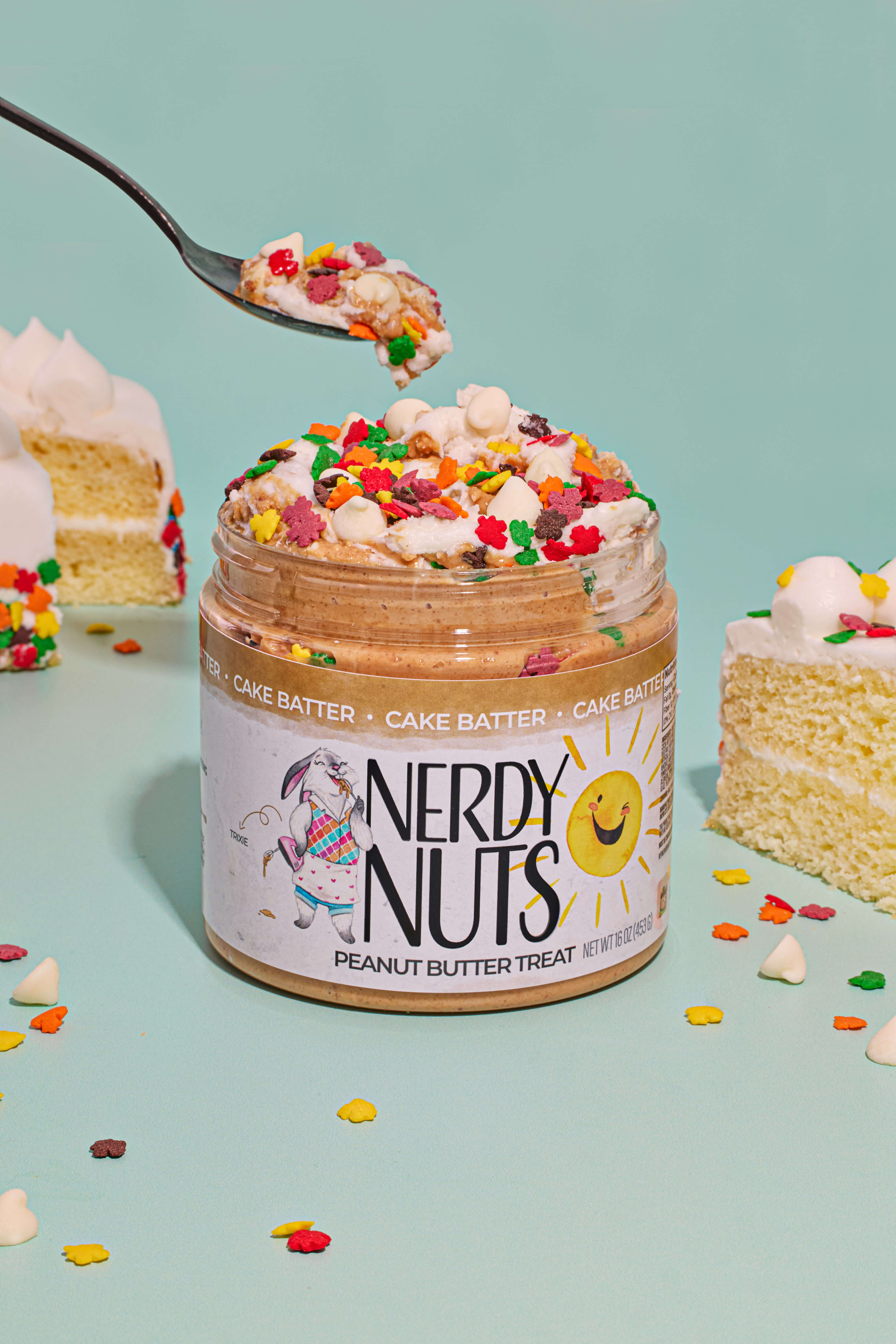 Cake Batter starts with a yellow cake peanut butter, and everything’s better with frosting, so we swirl in a nice heap of buttercream frosting, and top this cake with festive sprinkles!