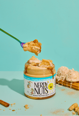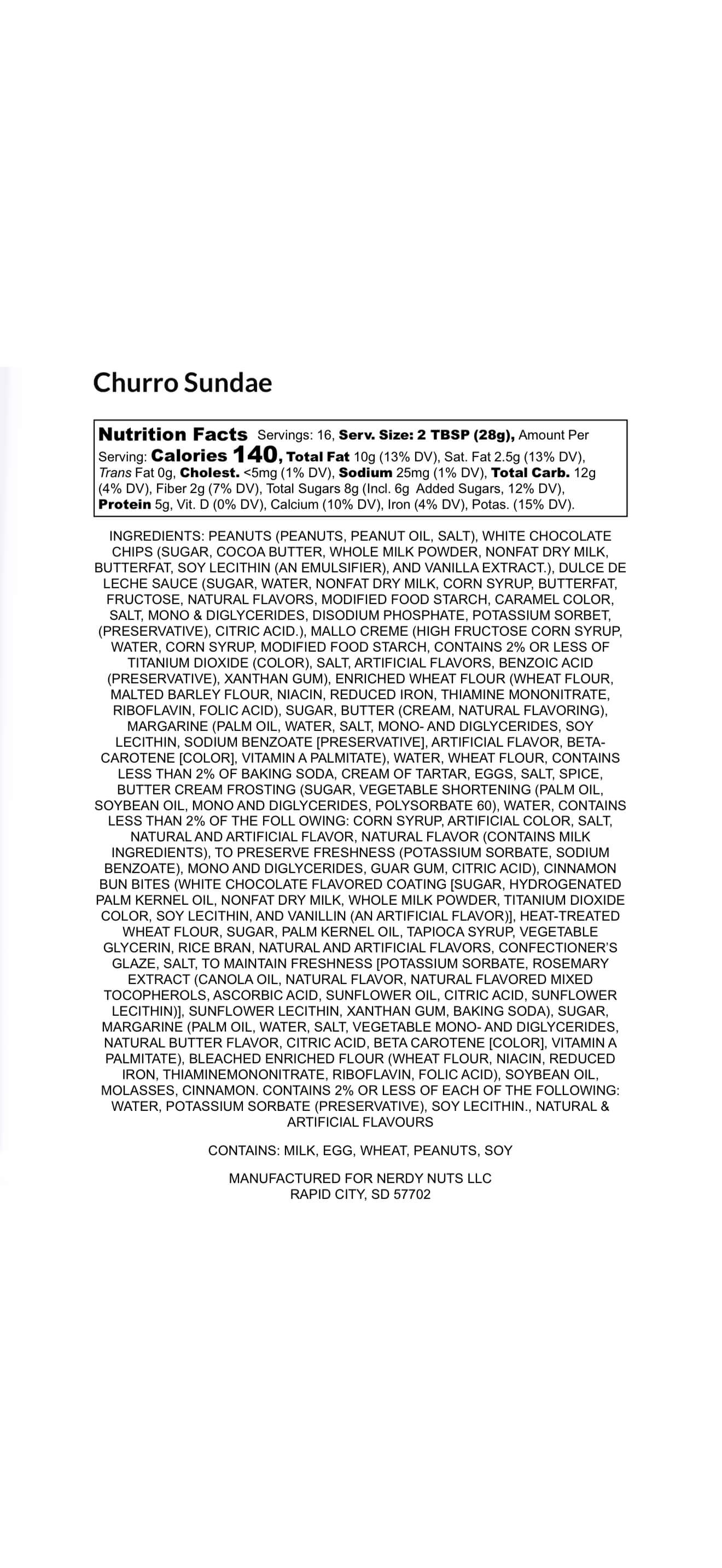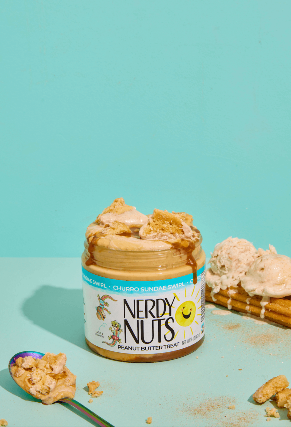 “Smunchy” churro peanut butter is layered on ice cream dulce de leche sauce, swirled with cinnamon churro mallow frosting, & chunks of snickerdoodle cookies!