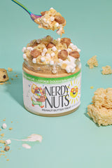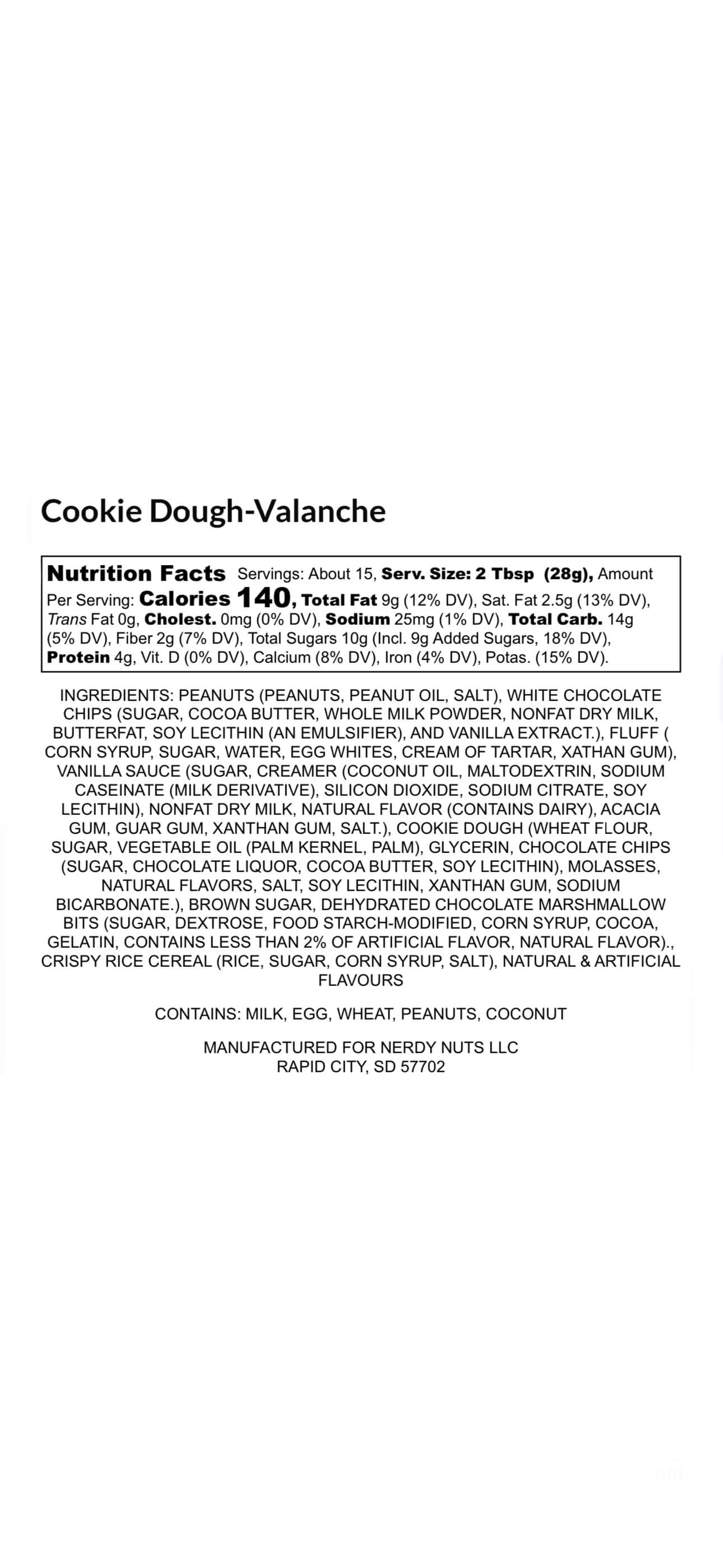 Brown sugar white chocolate peanut butter is layered on fluff and vanilla cookie dough sauce, topped with chocolate dehydrated mallow bits, crispy rice cereal, and cookie dough bites! Cookie dough rice crispy bar!