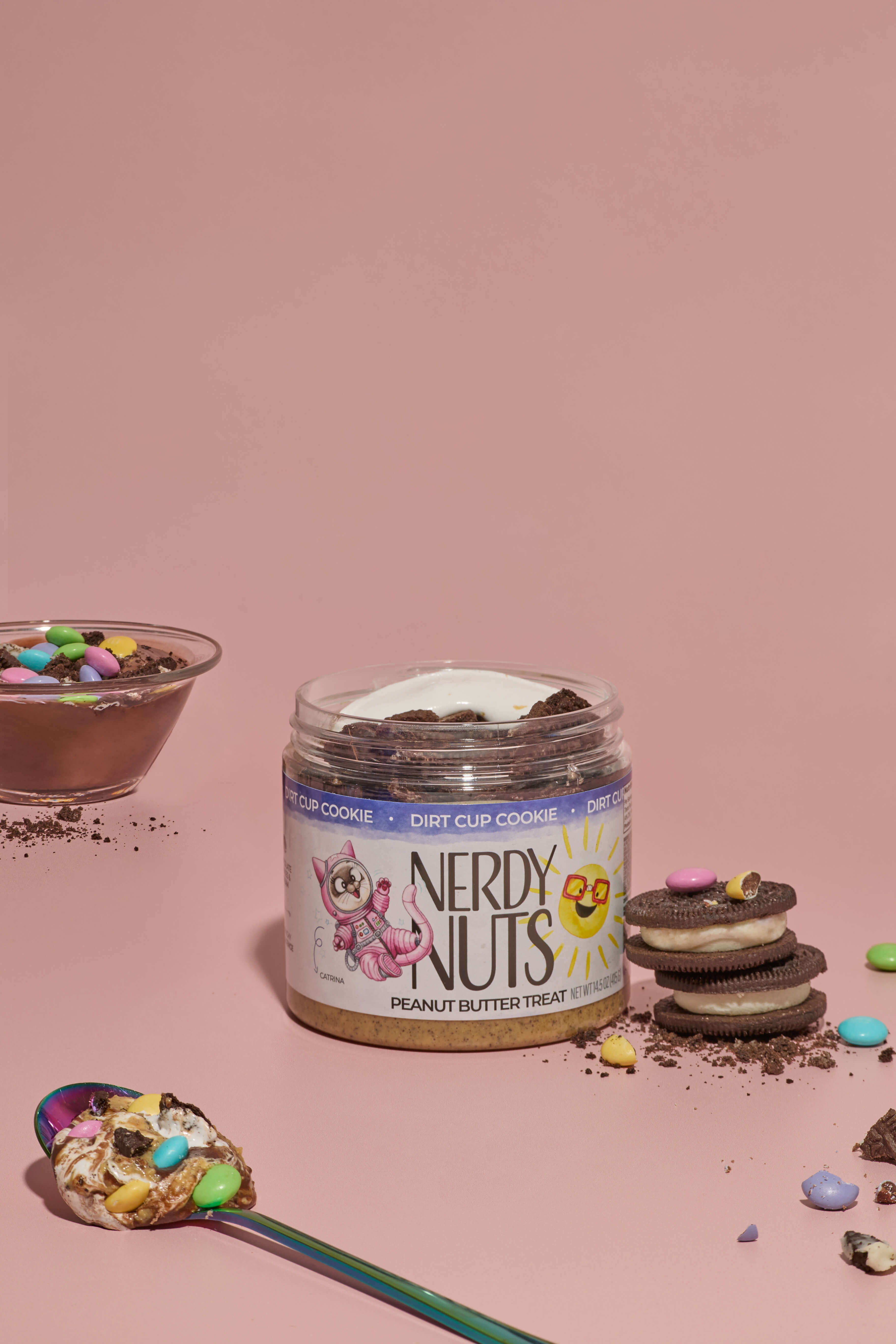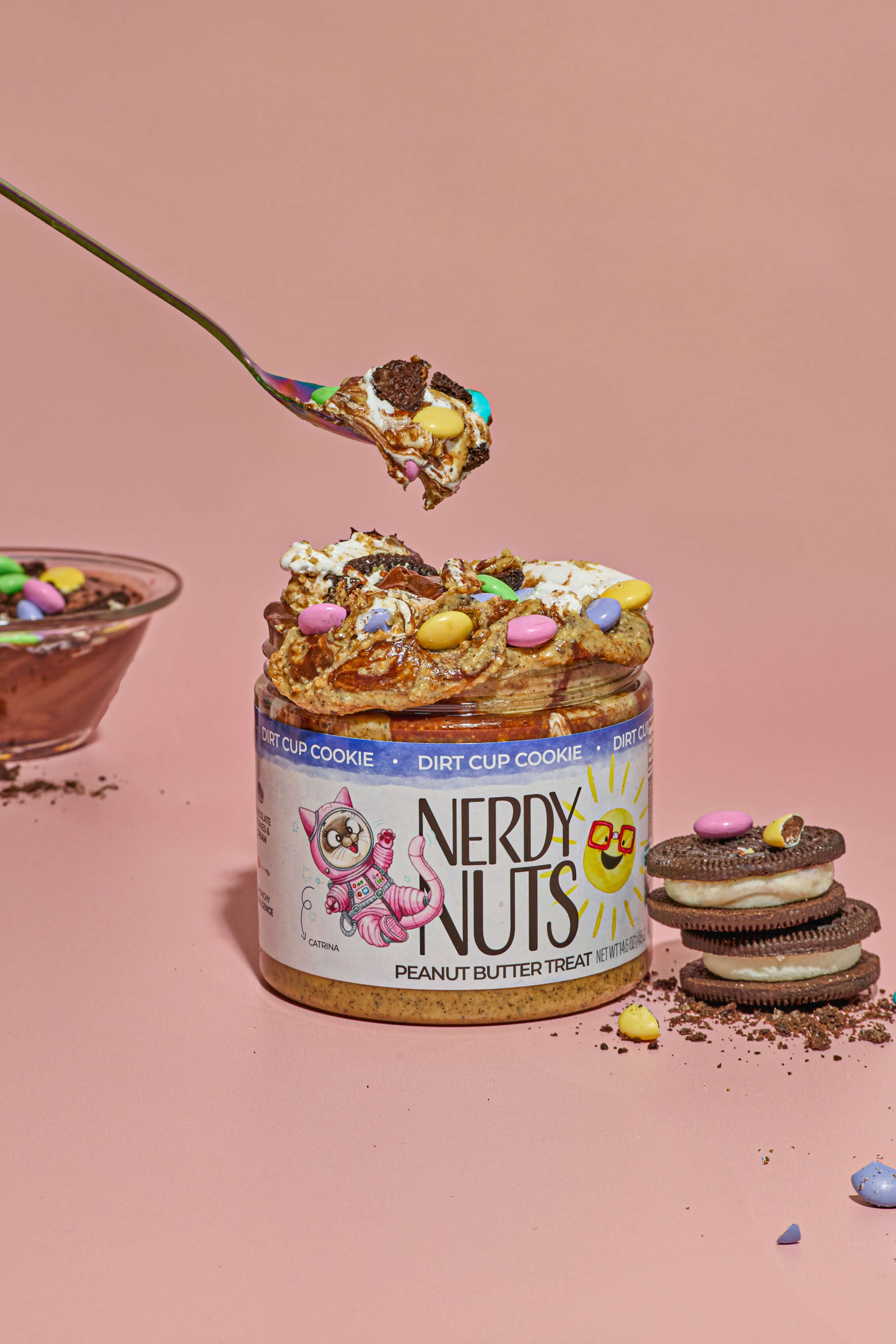 Cookies & cream peanut butter is layered on fluff, topped with chocolate pudding frosting, chocolate cookies & cream, & pastel candy coated chocolate gems! Dig into nostalgia!