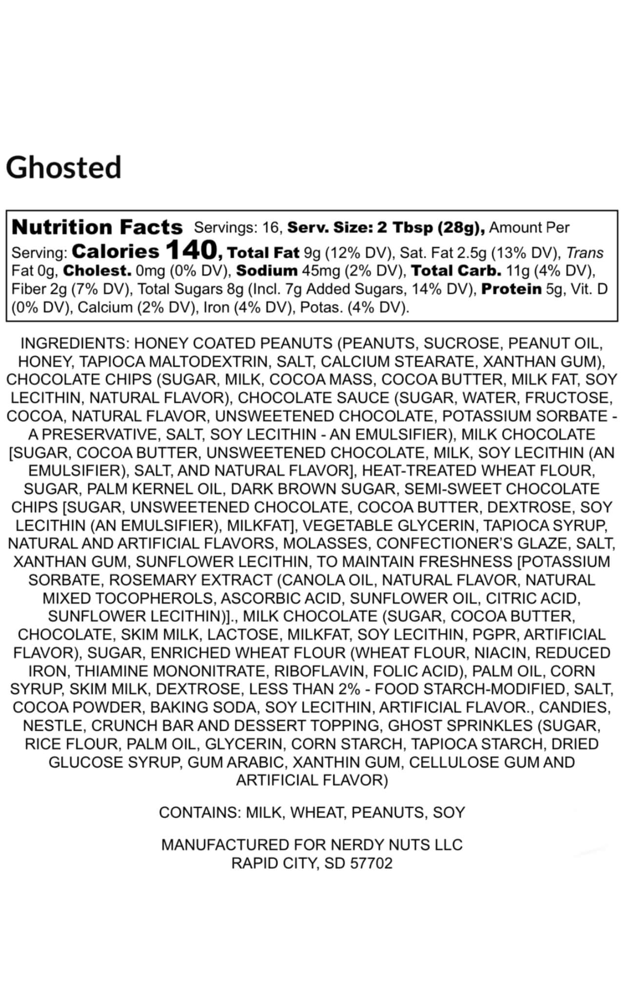 Sweet milk chocolate peanut butter is layered on chocolate sauce. We add in chocolate covered cookie dough, chopped crunchy chocolate bars, chopped caramel stix bars, and top if off with ghost sprinkles. This is a kind of Ghosted you'll be begging to have over and over again!