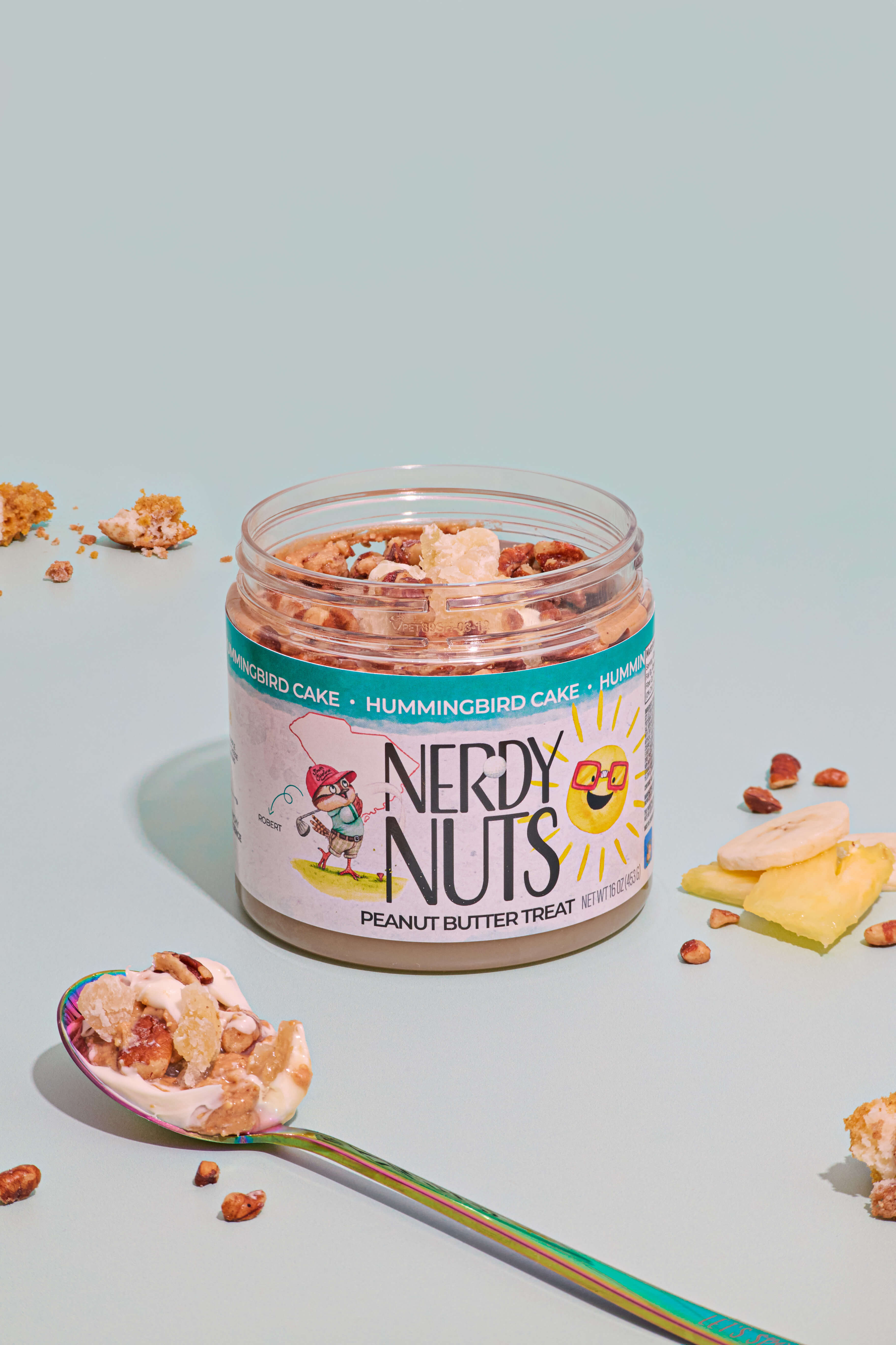 Banana cinnamon peanut butter layered on banana sauce, topped with pineapple cream cheese frosting, pineapple, & chopped pecans! The only thing left to ask: what do the hummingbirds gotta do with this cake??