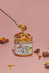 White chocolate peanut butter is topped with a scoop of chocolate hazelnut spread & all the goodies: caramel sauce, fudge brownie centers, and PB candy!