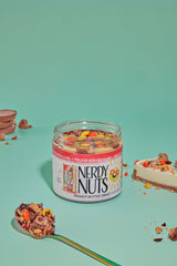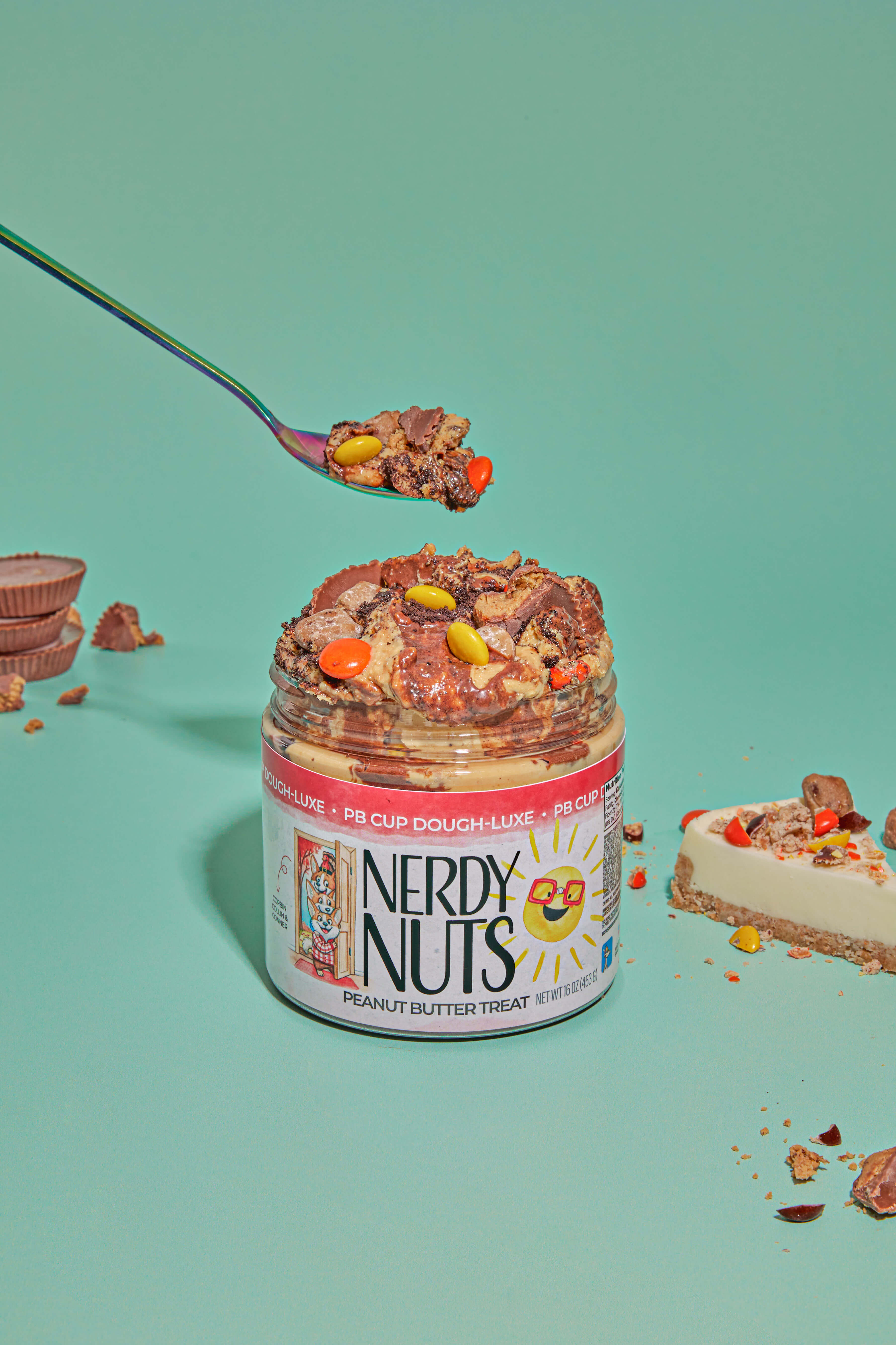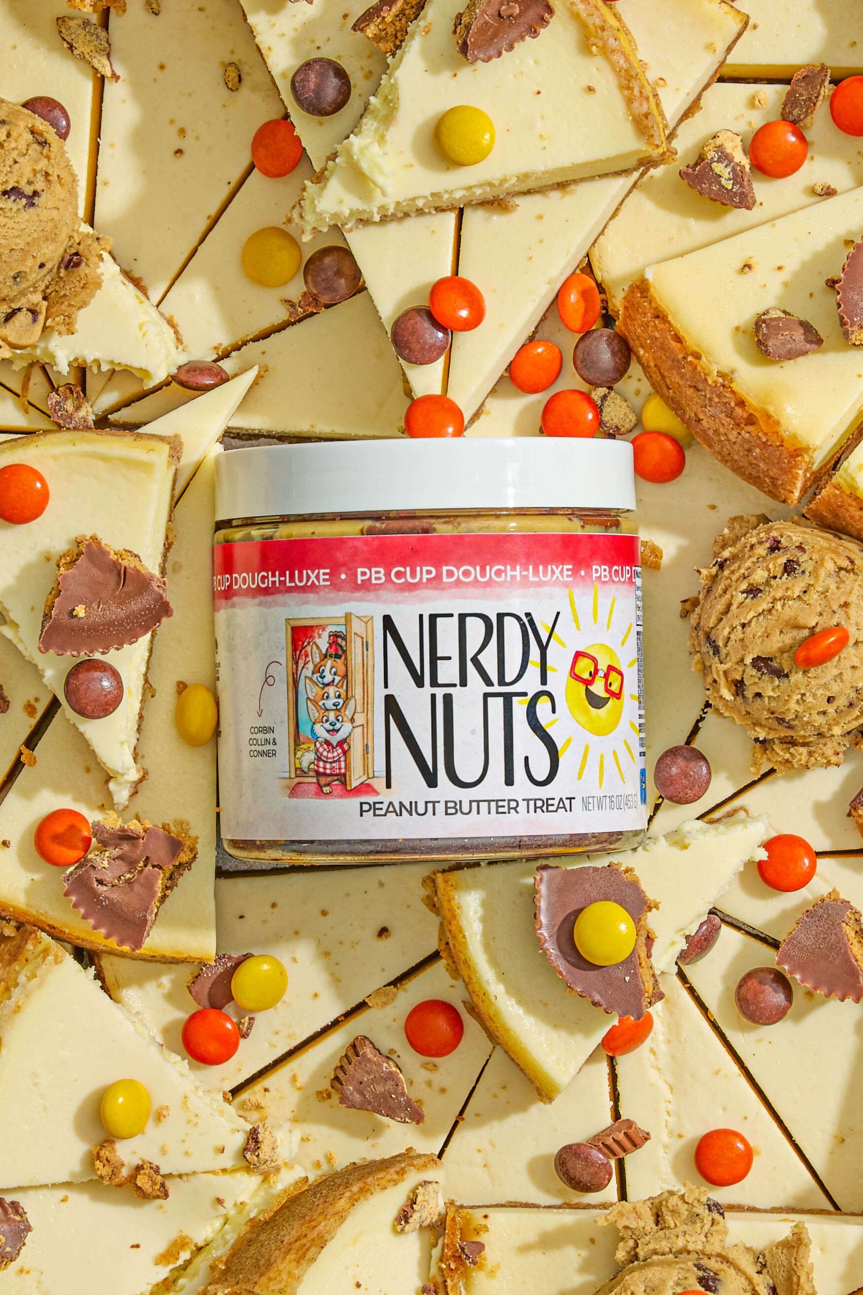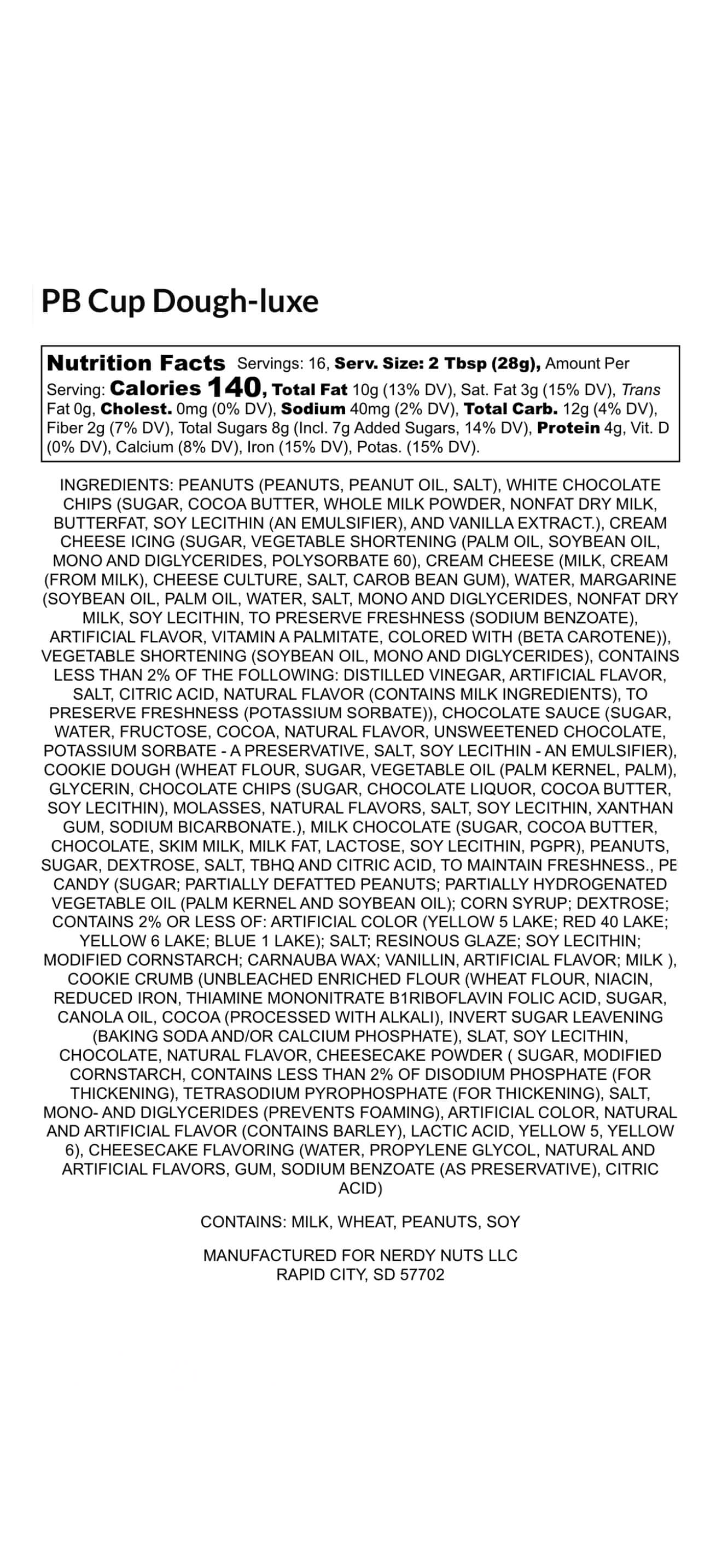 “Smunchy” white chocolate peanut butter is layered on chocolate cookie crumbs, swirled with chocolate cheesecake frosting, topped with cookie dough, chopped peanut butter cups, & PB candy!