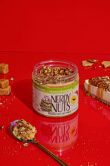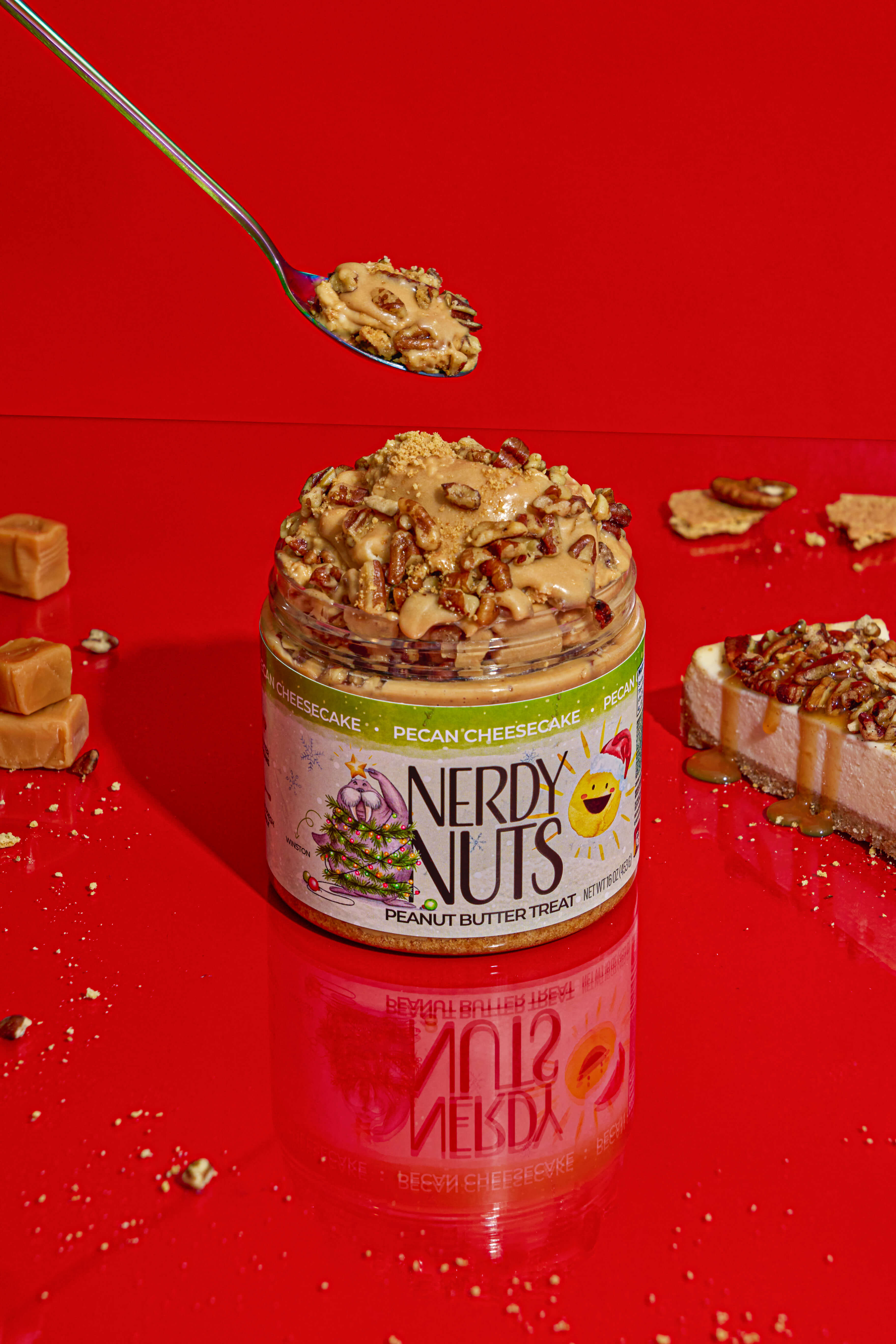Brown sugar cheesecake peanut butter is layered on graham cracker crumbs, topped with caramel pecan cheesecake topping & buttered pecans!