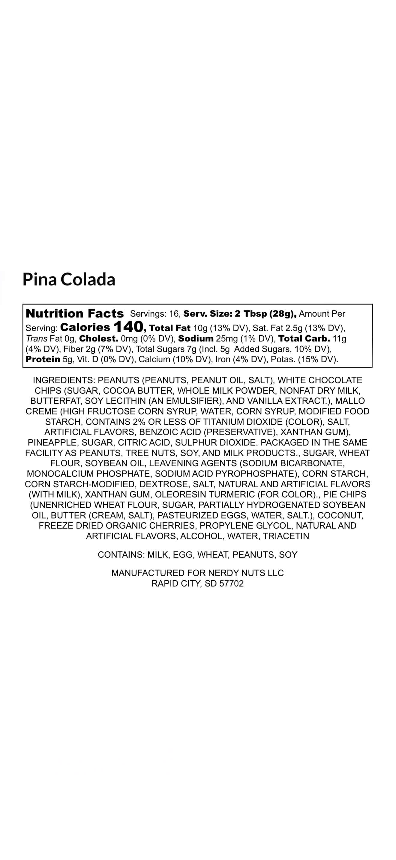 Pina Colada starts with coconut yellow cake peanut butter layered on pie chips. We pour in pina colada flavored mallow creme, and top it with dried pineapple bits and one dried cherry! A jar of paradise!