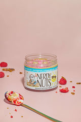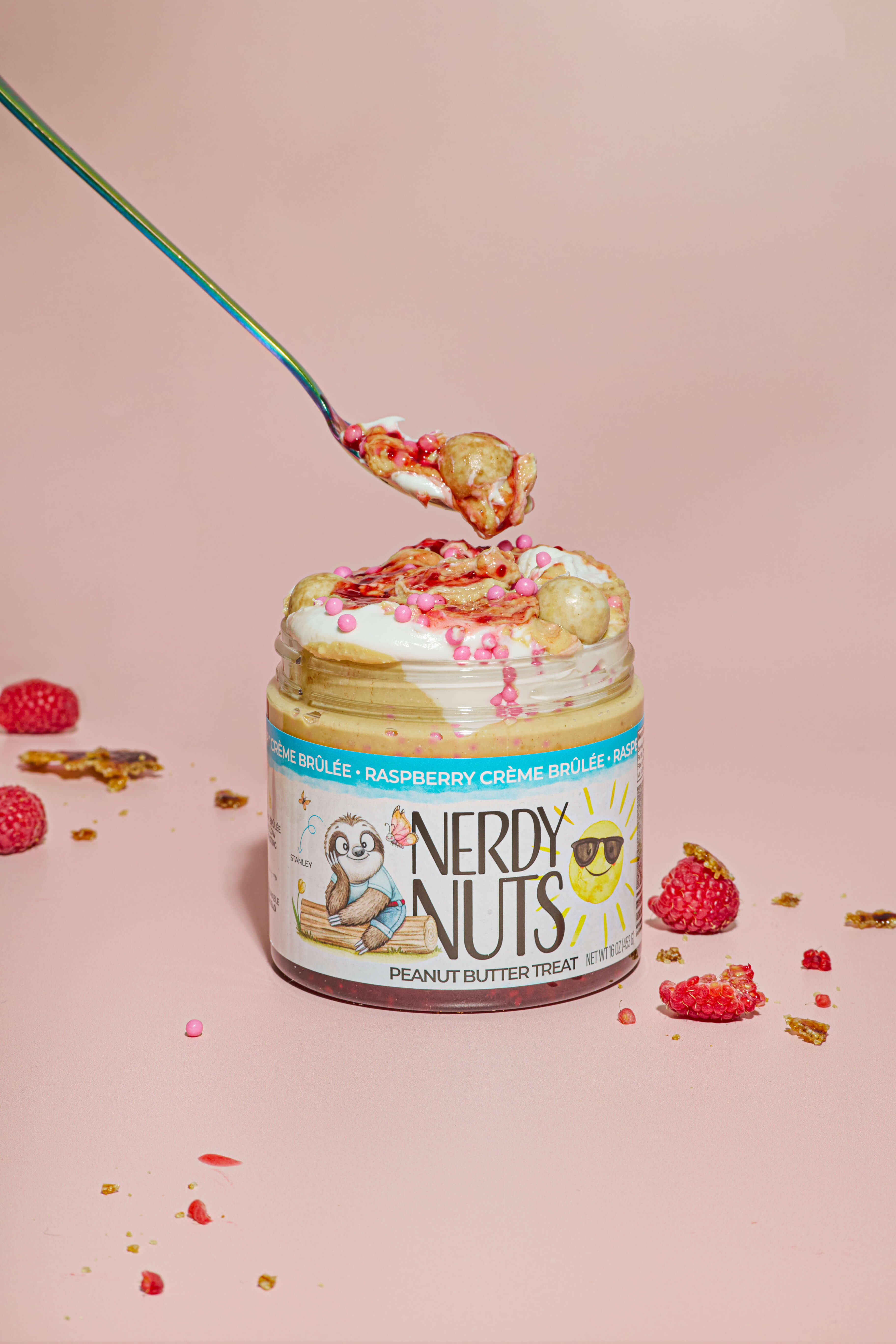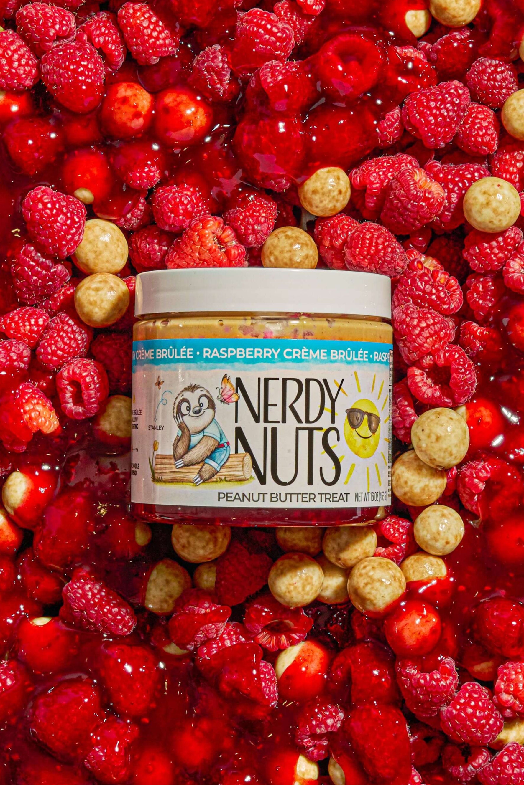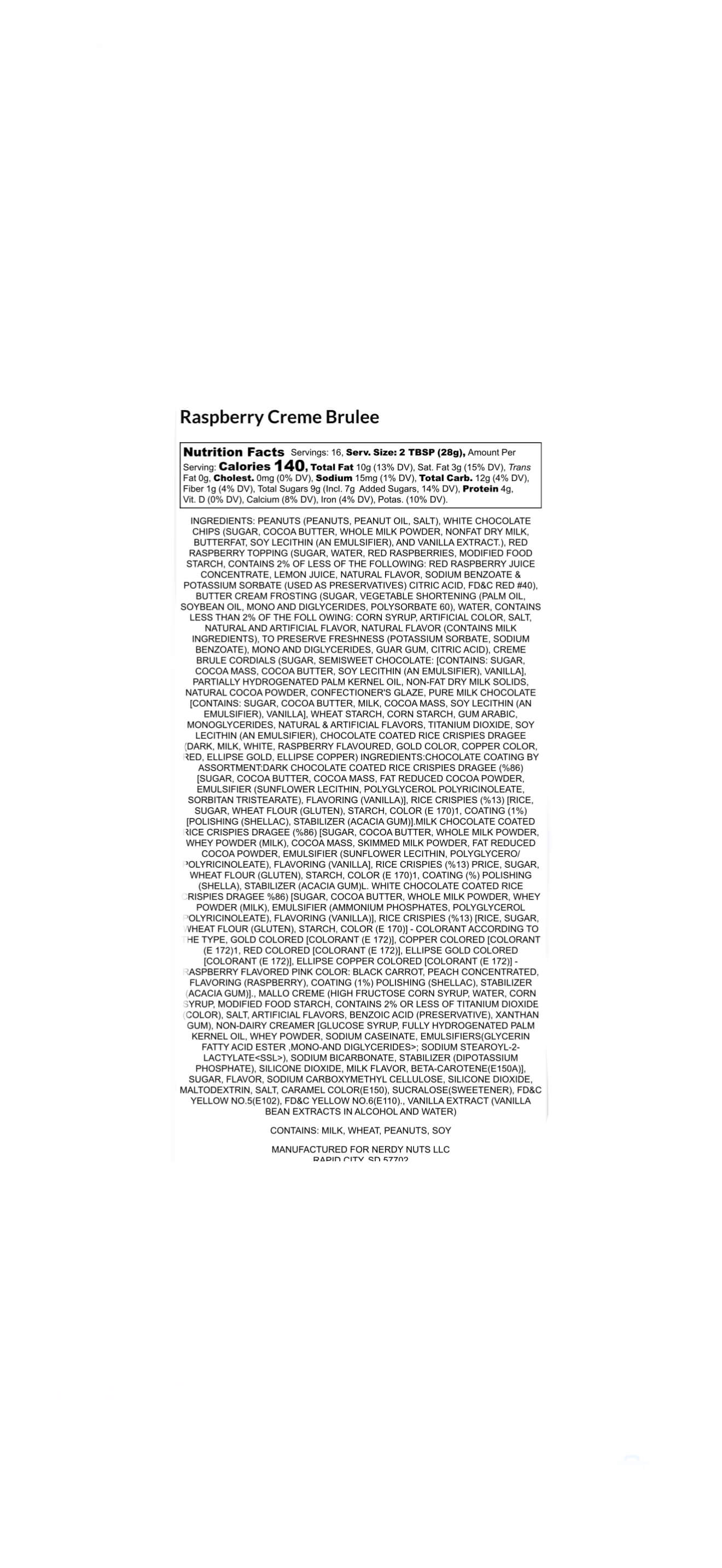 Creme brulee peanut butter is layered on raspberry sauce, topped with creme brulee mallow frosting, creme brulee cordials, & raspberry crispearls!