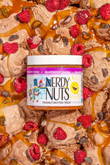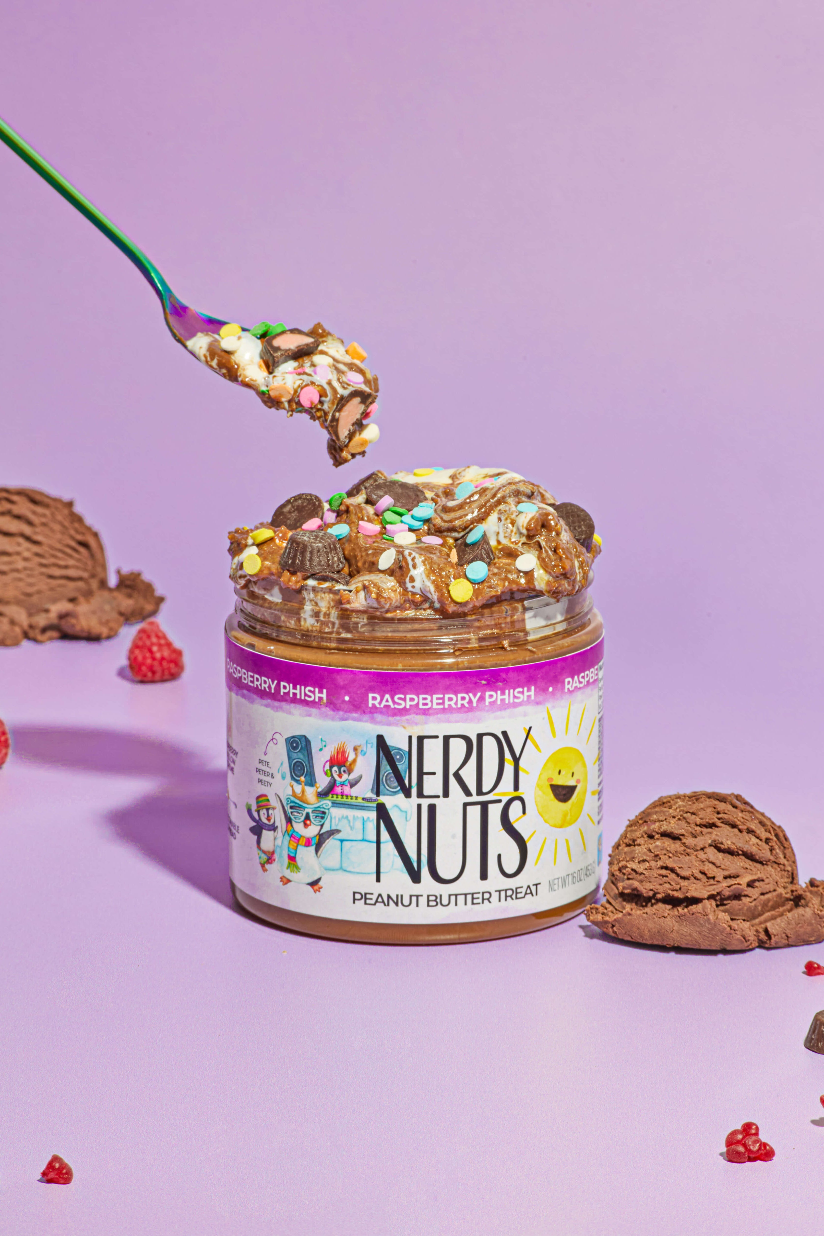 Sweet dark chocolate ice cream peanut butter is swirled with caramel sauce, raspberry mallow creme, mini chocolate raspberry cups, & sequin sprinkles!