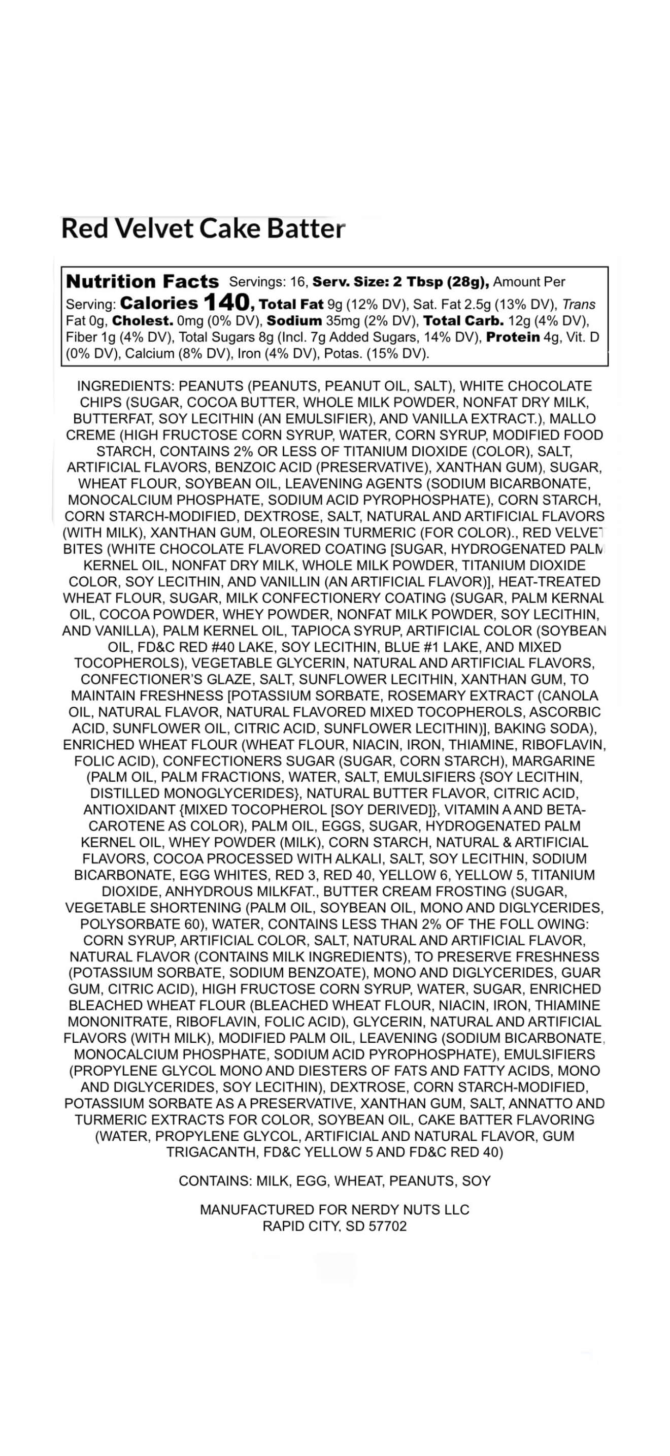 Yellow cake peanut butter is frosted with cake batter mallow frosting, topped with red velvet dough bites & red velvet cookies!