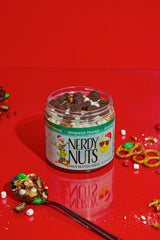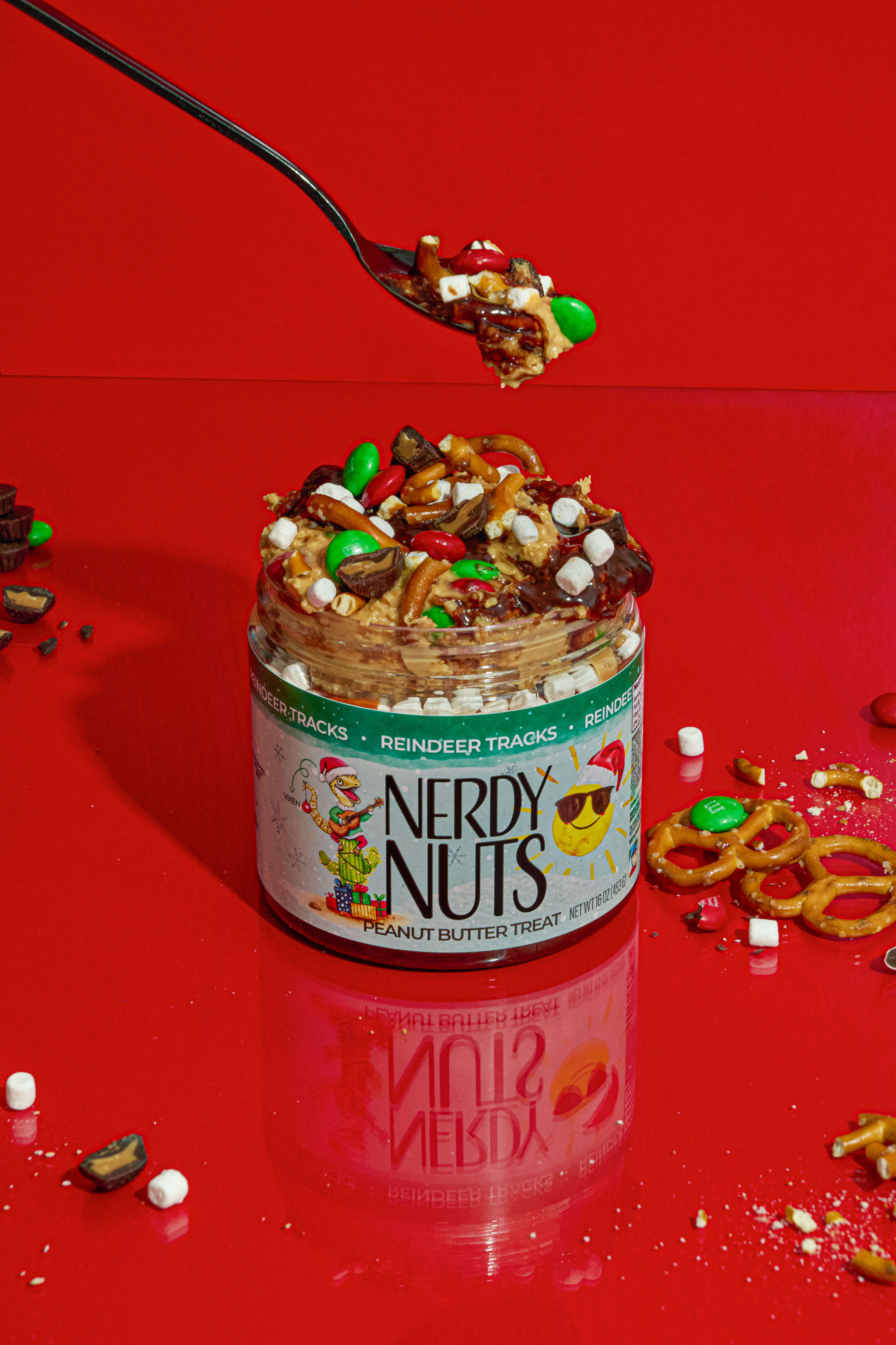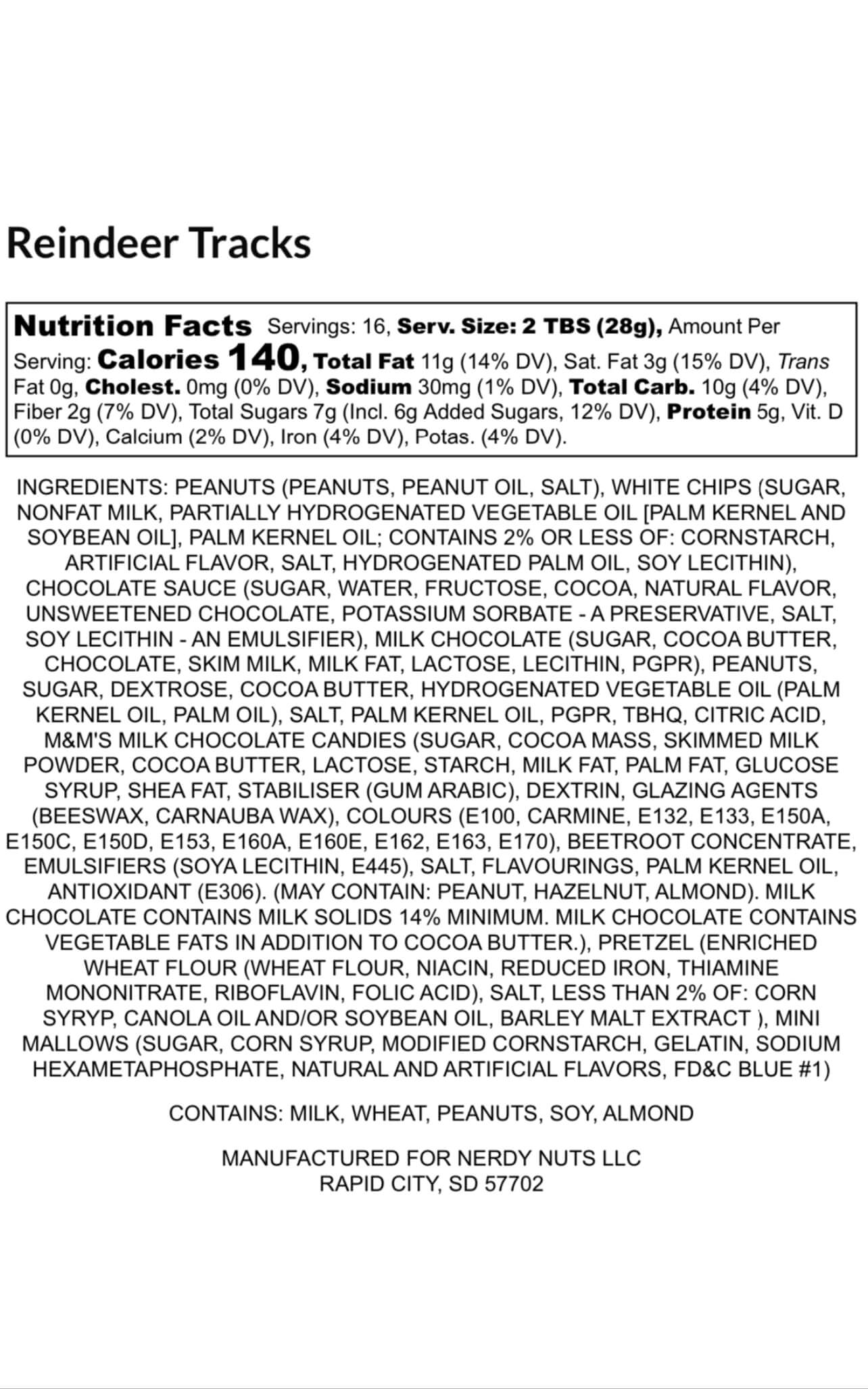 Reindeer Tracks starts with white chocolate peanut butter layered on chocolate sauce and mini PB cups. If you didn't already know, reindeer are notorious for being a bit over-the-top–so we tossed in dehydrated mallow bits, crunchy pretzels, and holiday-colored chocolate gems!