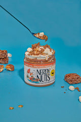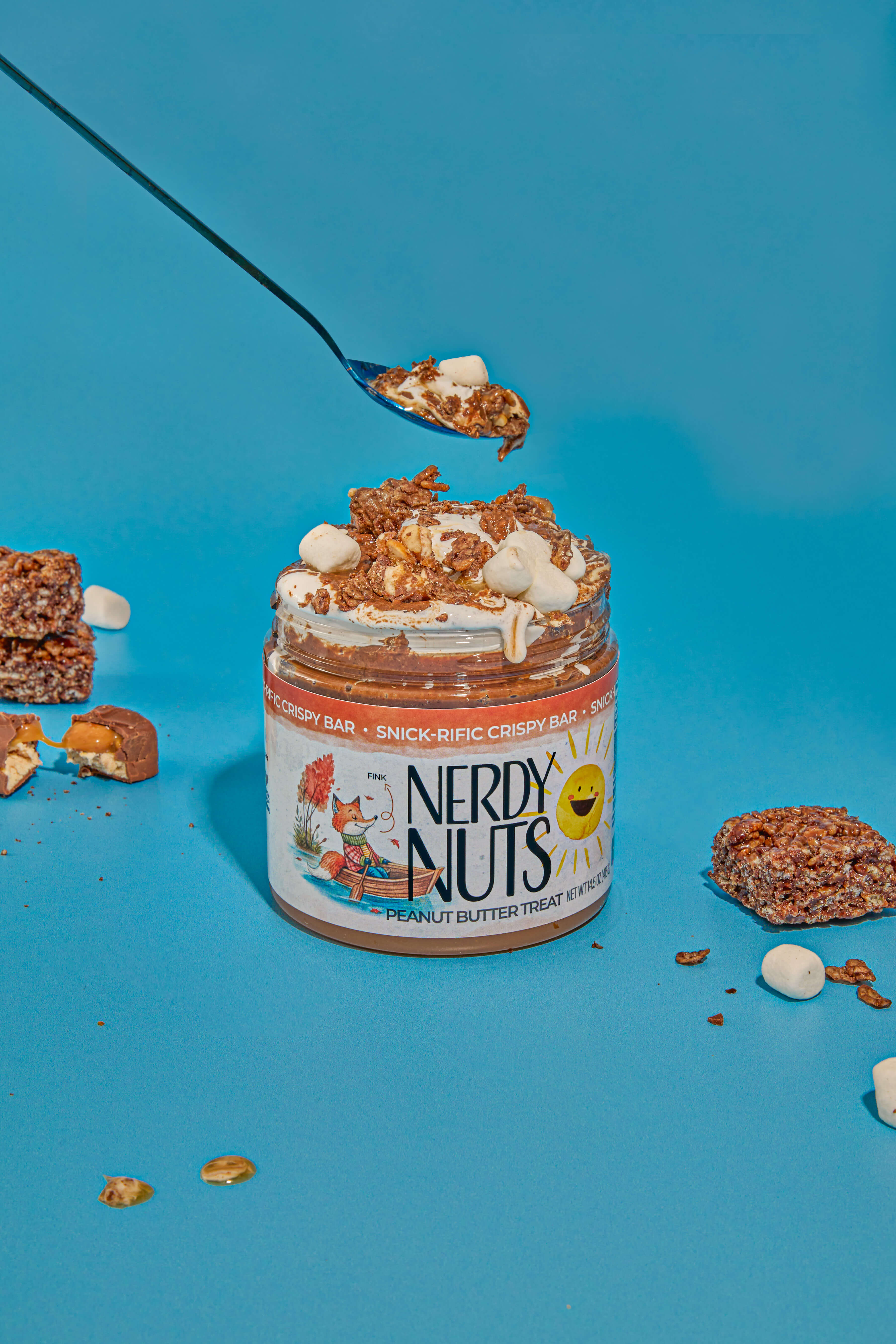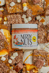 Sweet dark chocolate peanut butter is layered on fluff and caramel sauce, topped with chocolate crispy rice cereal, fluffy mini marshmallows, and chopped caramel peanut candy bar pieces!