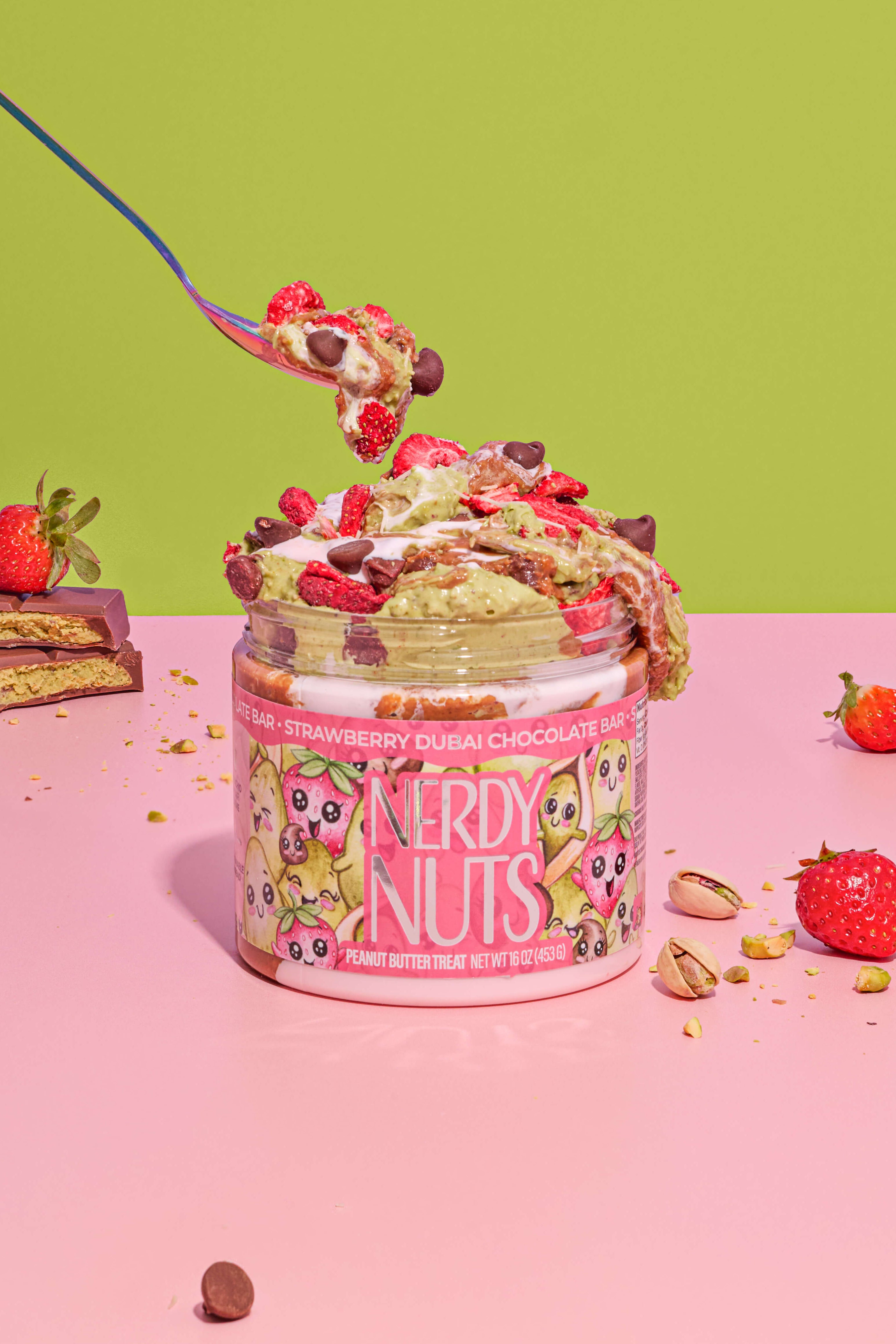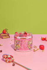 Sweet & crunchy milk chocolate kataifi peanut butter is layered on strawberry mallow creme, topped with crunchy pistachio kataifi cream, chocolate chips, & strawberries!