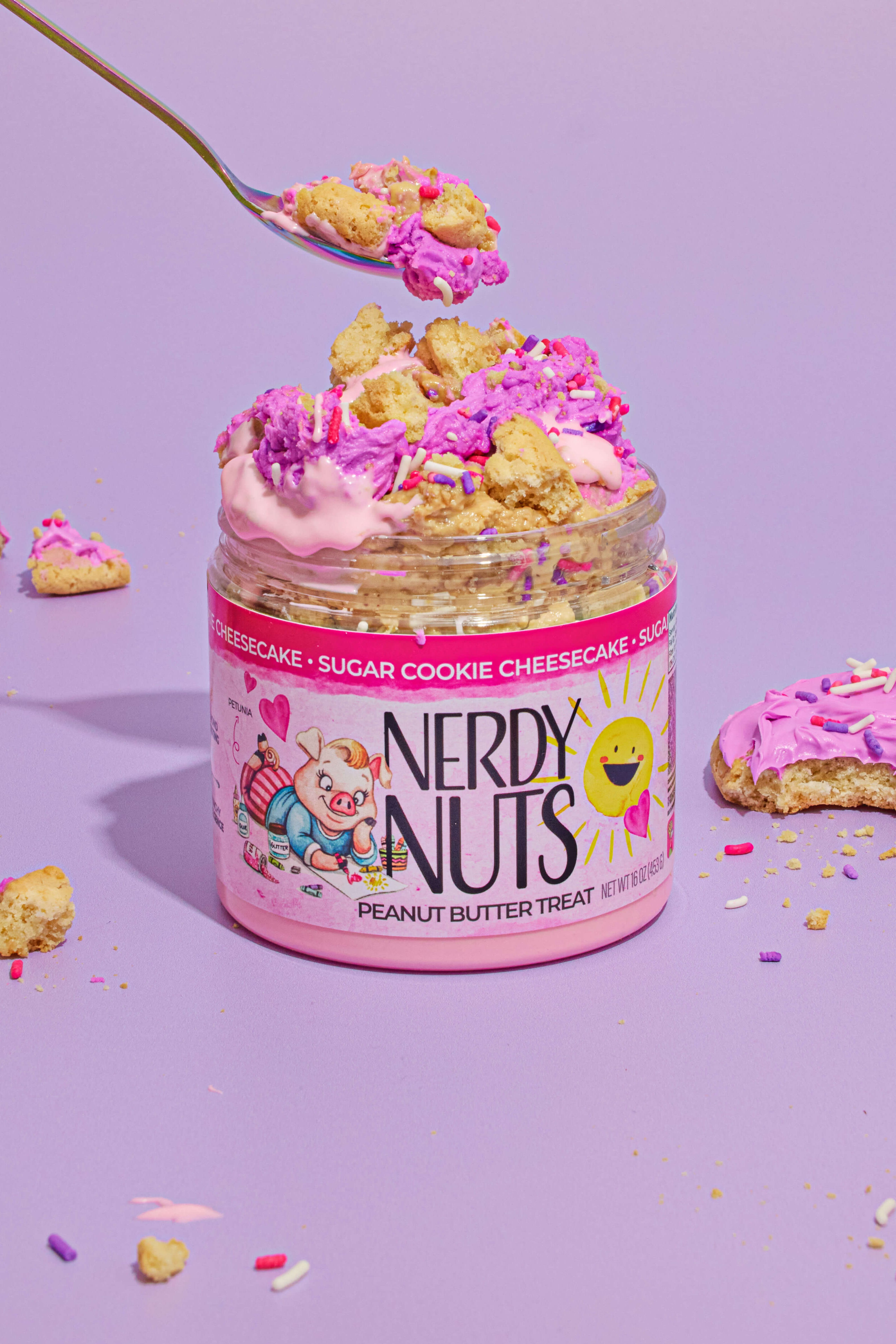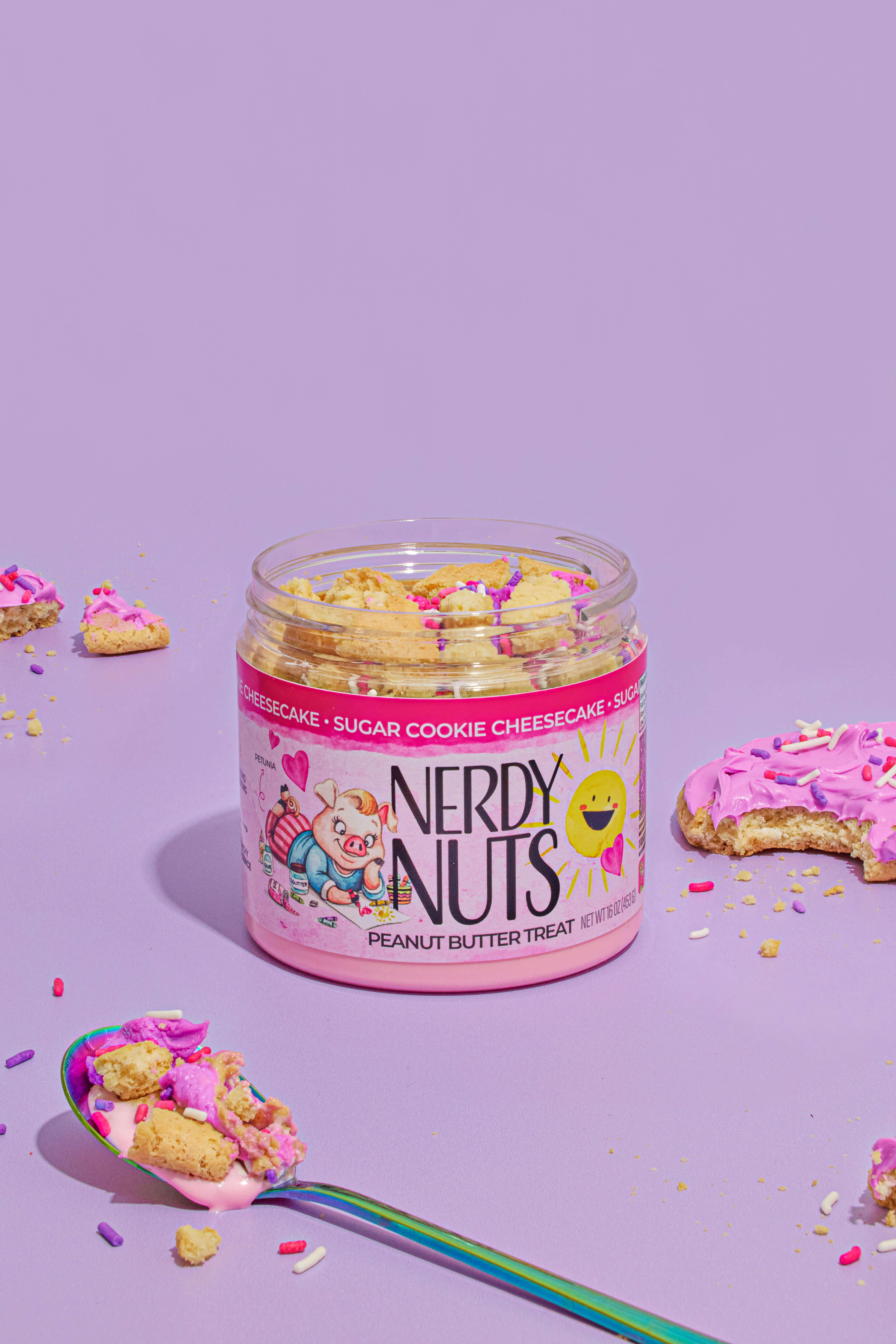 White chocolate cheesecake peanut butter is layered on cheesecake mallow frosting, topped with almond flavored frosting, chunks of sugar cookies, & festive sprinkles!