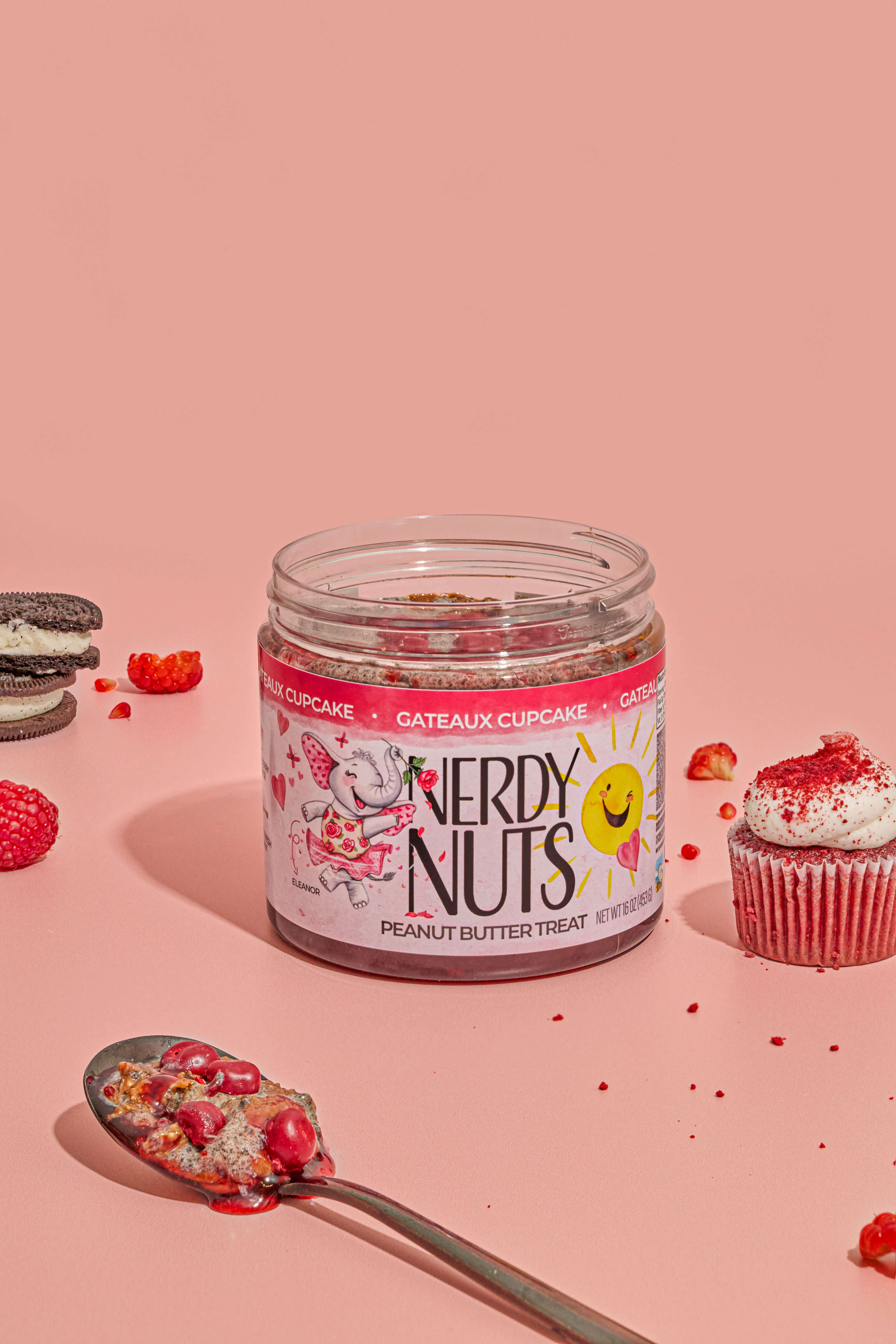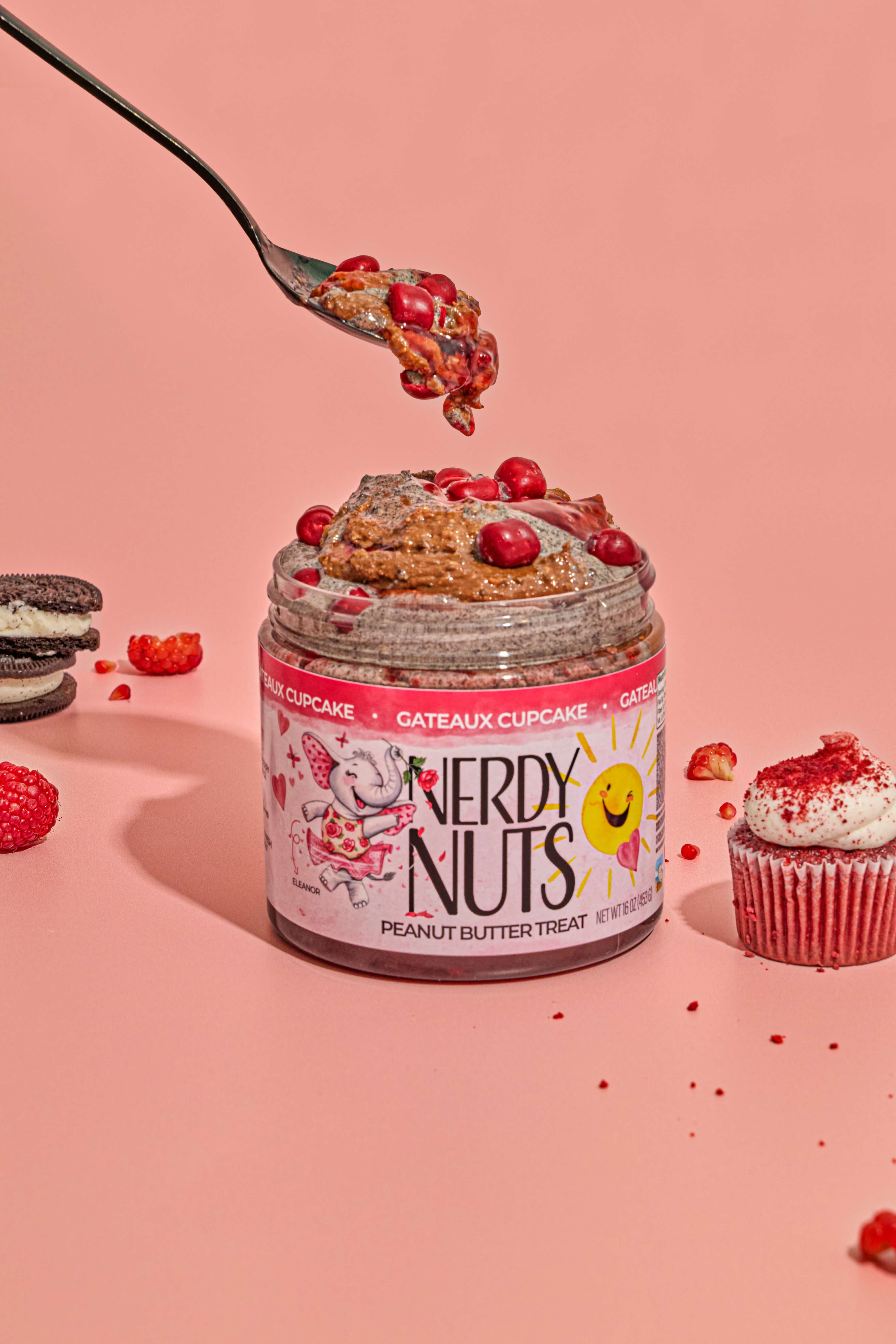 This beauty starts with sweet dark chocolate peanut butter layered on raspberry sauce, swirled with cookies & cream topping, & topped with red velvet dough bites!