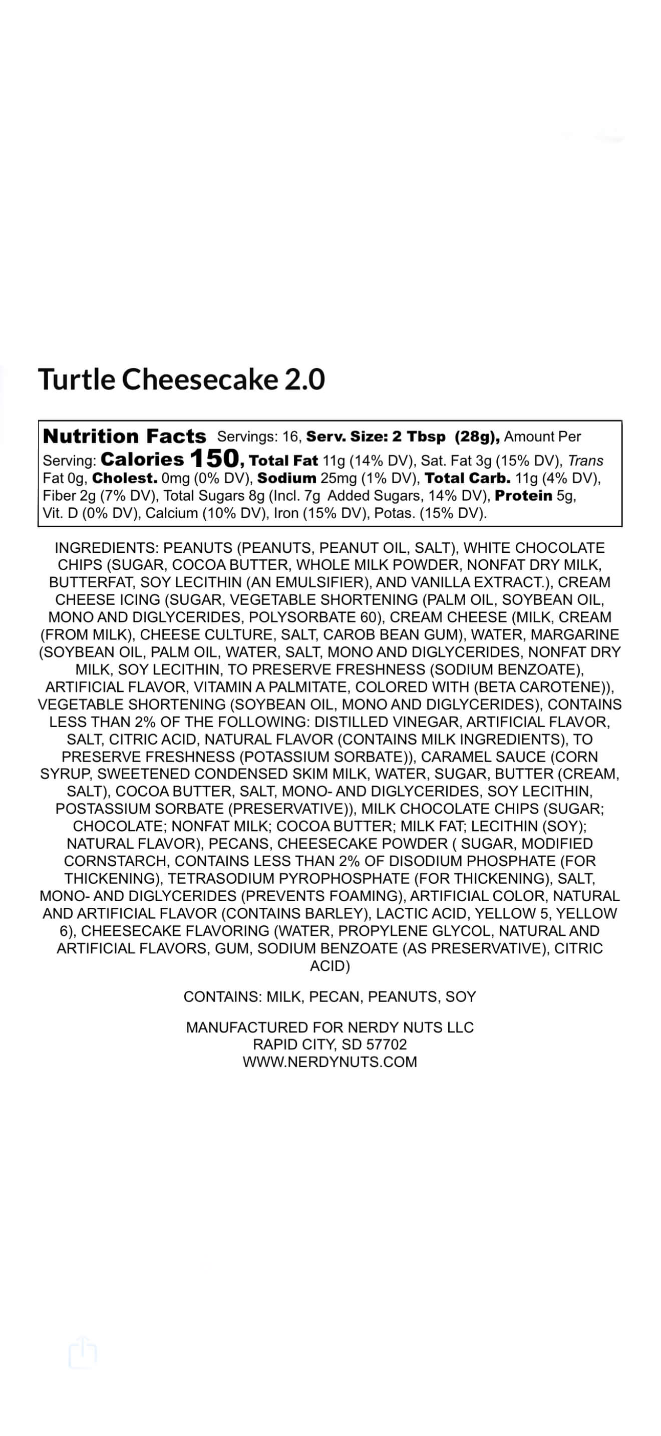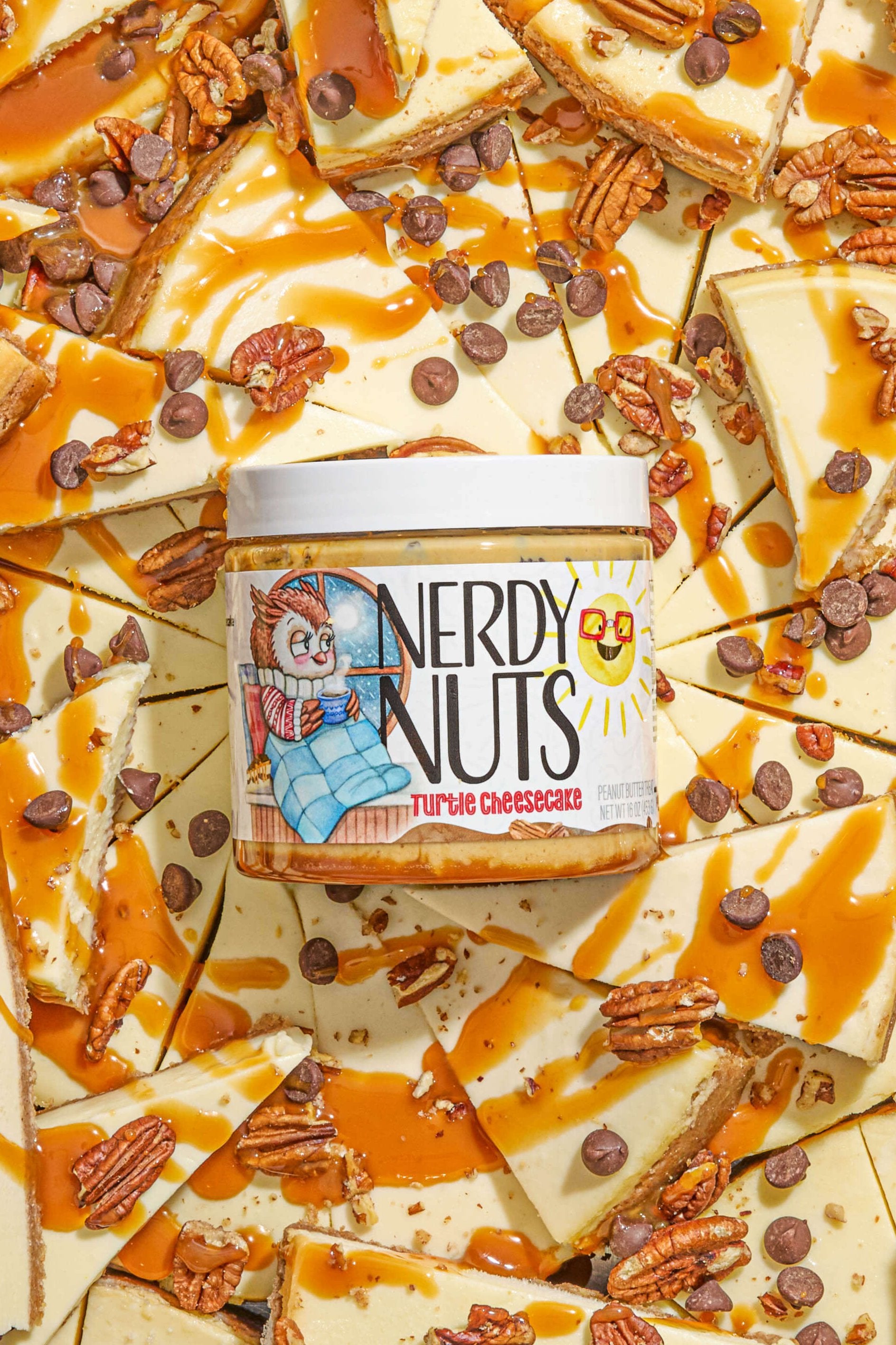 Turtle Cheesecake is our white chocolate cheesecake peanut butter with layers of caramel cheesecake frosting, topped with chocolate chips and chopped pecans. No shame in the game if you go back for a second spoonful.