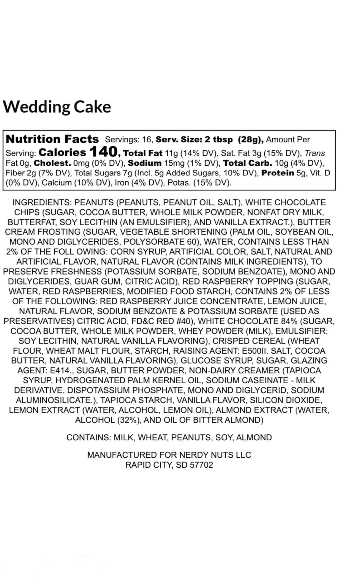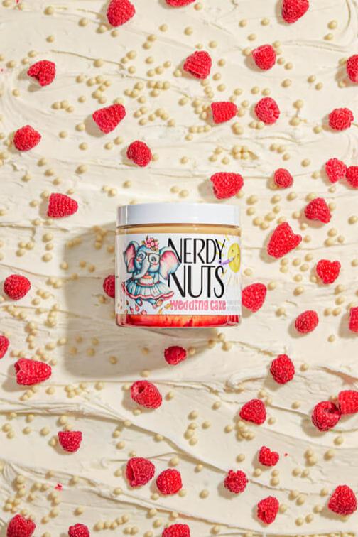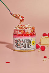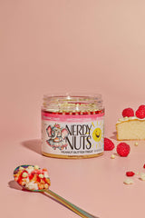 Vanilla peanut butter is layered on raspberry sauce with a *hint* of lemon, topped with sweet almond frosting and white crispearls!