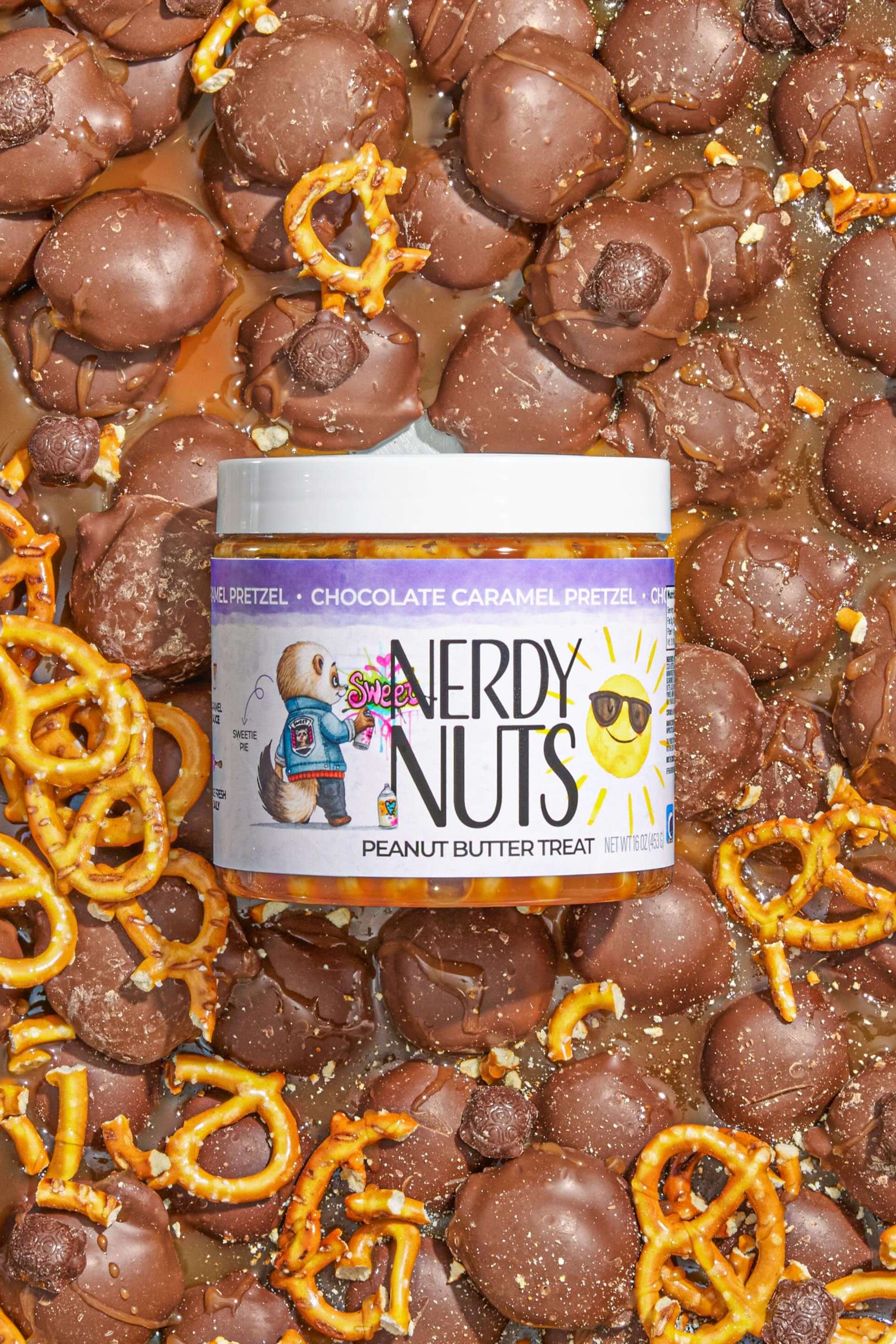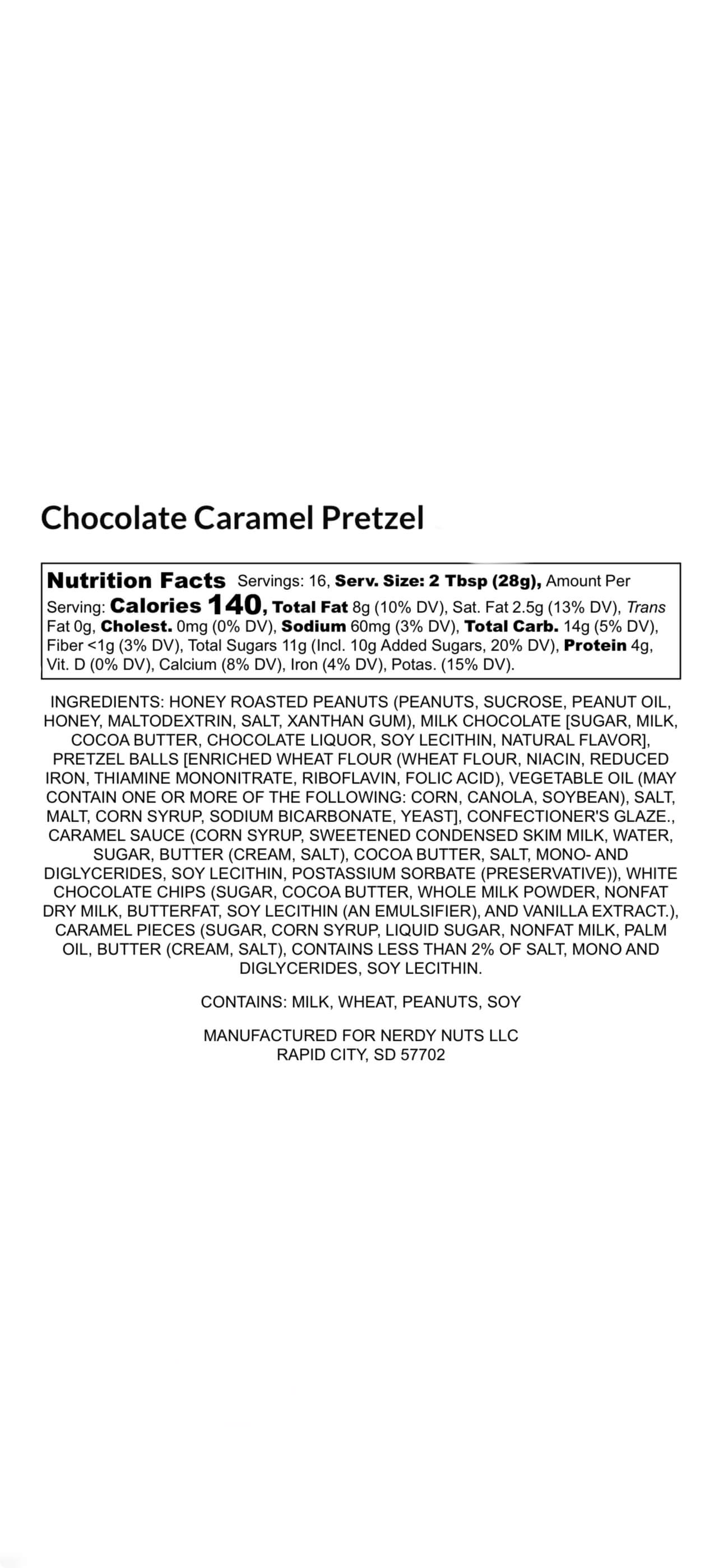 Sweet white chocolate peanut butter is layered on caramel sauce, caramel bits, and chocolate covered pretzel balls, swirled with MORE caramel sauce, caramel bits, and chocolate covered pretzel balls!